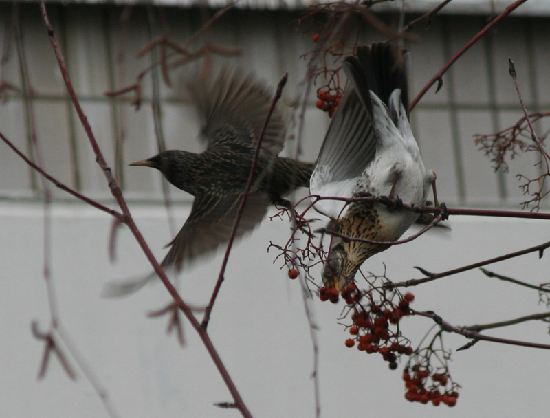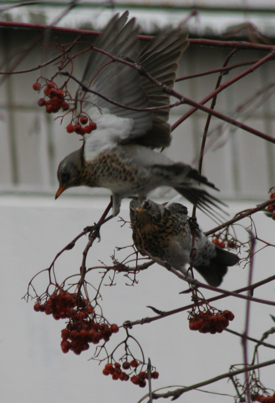 Сегодня в Бутово залетели сотенные стаи дроздов-рябинников. Шум, гам, атака на последние оставшиеся ягоды рябины. Теперь в их пузах ягоды долетят до ближайних перелесков, птички пукнут - и через некоторое время в лесном подросте появятся новые рябинки. Круговорот консументов и продуцентов, однако..
