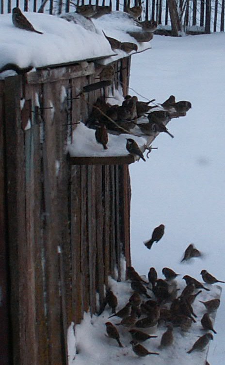 У меня первый год, как не прилетают снегири (1 раз были), нет свиристелей и не знаю как называются- зелененькие с оливковым с воробья размером. В этом году на одном поле после уборки нашла кучу зерна- разнообразила им корм. Стало много сорок летать, но на фотоаппарат никак не попадут