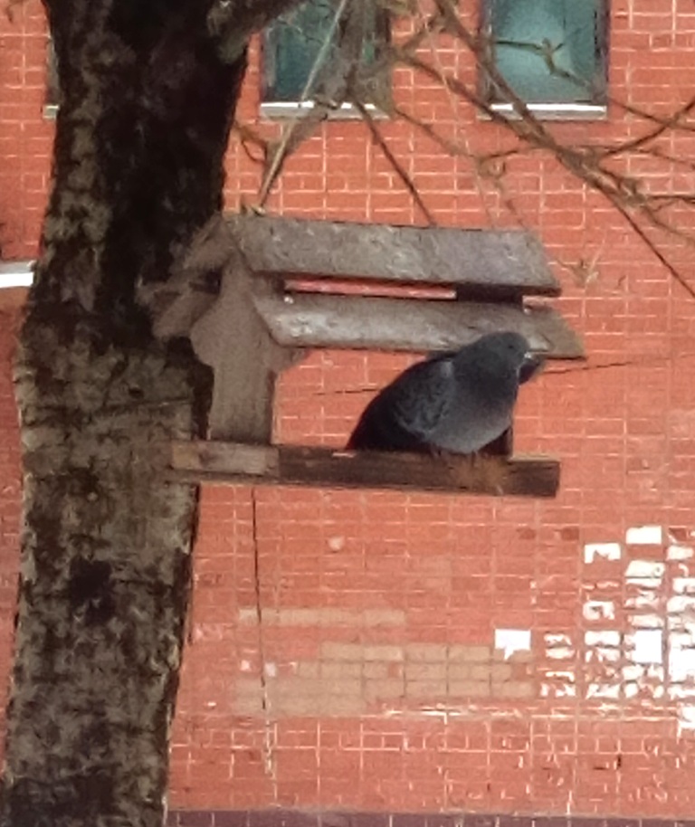 Интересно, что воробьи едят из кормушек, которые висят близко к земле, а из нашей «высотной» - только синицы, а воробьи смотрят, иногда даже гоняют синиц, но сами ни разу в кормушку не заходили, сидят не ближе метра от неё. Может, воробьи боятся есть на высоте? Несколько дней назад прилетали свиристели и сойки, но их синицы отогнали. Санкт-Петербург, район Гражданка. |