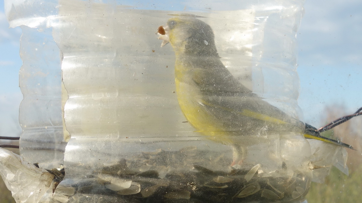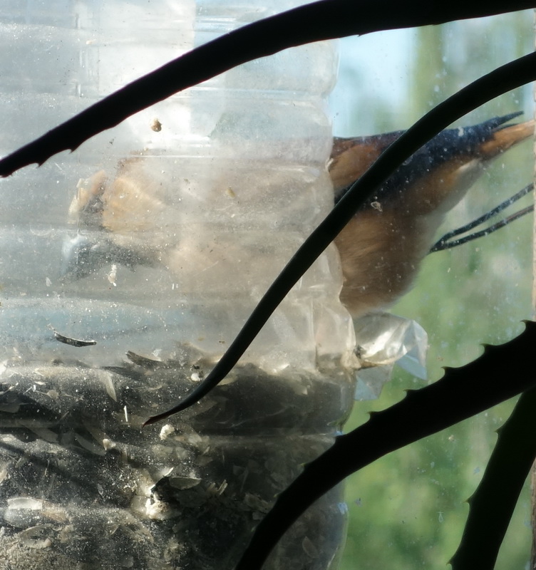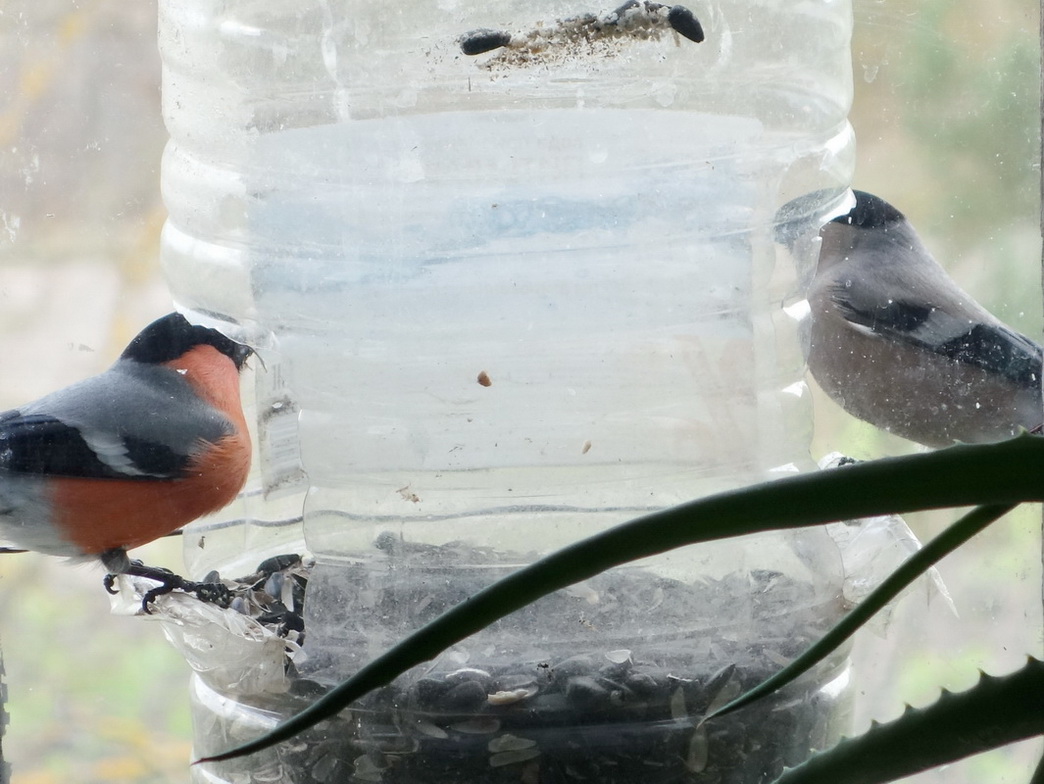 Зима, как обычно подкралась внезапно! Пора кормить, а кормить нечем! В прошлом сезоне орава воробьёв слопала килограммов 60 пшена и не поморщилась. Брал его (для цыплят) по 15 р. за кг. В этом сезоне такого корма не продают, а килограмм обычного пшена уже 40-50р. Как жить, товарищи?!! На базаре пришлось взять ведро проса за 180р. и разбавить его 3-х килограммовым пакетом пшена за 180р. Итого - 300р. за 10 кг. корма. Чтобы пцыцы не обожрались, корм насыпаю в кормушку-дозатор из полторашки - полкило в день. Короче, запасов у меня всего на 20 дней. Что-то, наше "хобби" становится затратным... На семечки они чихать хотели, правда хорошо щиплют сало! Гоняют даже синиц! Сало, сегодня повесил, а то уже синицы в окно стучать стали - помнят однако, да и снег уже обещают через день. Да, для дятлов отдельно вешать сало необязательно, синицы его всё равно найдут. У птиц субординация по размерам - когда дятел кормится, остальные почтительно наблюдают со стороны. -------------------- Правительство у нас хорошее, это с народом ему не везёт!