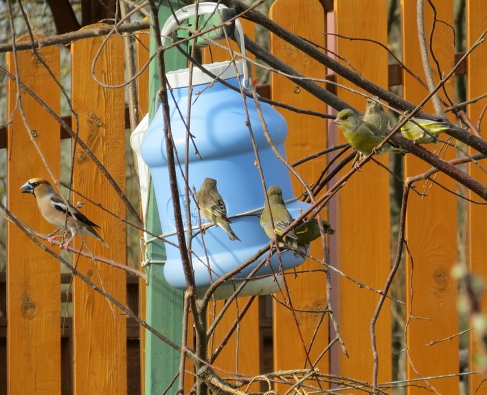 Помогаем бедолагам с конца ноября. А куда деваться, ругаться будут, обматерят ещё, нутряной козий жир, сало, семечки - всё в ход идёт, пернатая мелочь довольна, даже дятлы постоянно заглядывают, им тоже несладко сейчас.