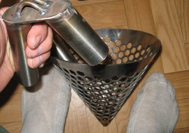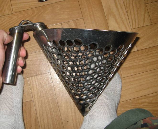 но я не вижу смысла делать для конуса мельче отверстия(основные)...,там внизу можно сделать мельче или так как я сделал с каплевидными ловушками... inst.сьёмная деревяная (ясень в парафине) ручка длиной 1,2-1,25 м влазит в багажник... каждый делает ручку которая ему удобна,главное чтоб ручка была слабее скупа... но как по мне то простая цилиндрическая форма и плотное пропарафиненое дерево при небольшом опыте творит чудеса... всякие неровности и ручки на рукояти скупа мешают делать манипуляции со скупом...,всё гениальное-просто. зы: узнал я совочек откупленый в ВВК. -------------------- если у Вас нет моего скупа для пляжного поиска,можете написать мне в личку ...