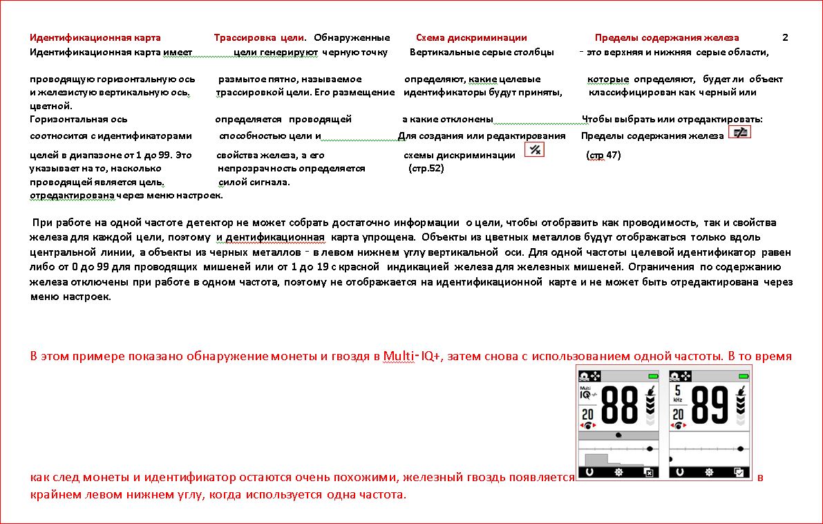 QUOTE(Старый Сибиряк @ Feb 21 2023, 10:29) центральная линия я так понимаю это ориентир для четкой цветной цели, которая имеет размер 5 на 5 мм или чуть больше, и он ее четкой поймал. Это скорее всего когда цель близко к катушке, если глубоко в земле, там может уже и путать рисунок. Вот немного по карте идентификации из инструкции. Вложенные эскизы изображений |