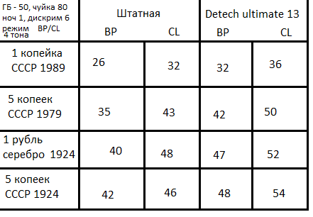 QUOTE(Snakes @ Feb 6 2013, 17:43) нечего было делать, вот небольшой тест, тест не на что не претендует, просто может кому пригодится немного информации. тест по воздуху в квартире, прибор Fisher F75 Black. из замечаний у Detech провод короче штатной на 10 см. по шумности почти одинаково тихие на таких настройках , разница только если штатная пискнула раза 2 то Detech раза 4. А где же мелкая монета -------------------- За работу ПР ответственности не несу!