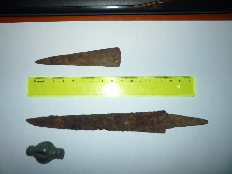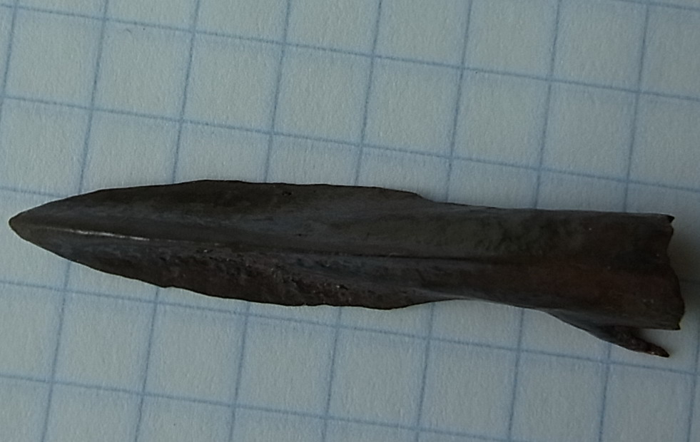 Подскажите по наконечнику стрелы (как я предполагаю, для копья маловат, на тыльной стороне видно утоньшение металла, видимо вставлялся в расщеп), к какой культуре и какой эпохе принадлежит. Поднят на берегу реки в Республике Коми. Сопутка - нож и Ф-образная бронзовая пронизка.