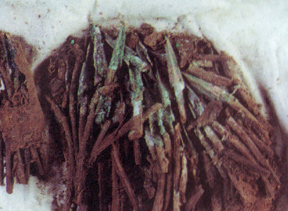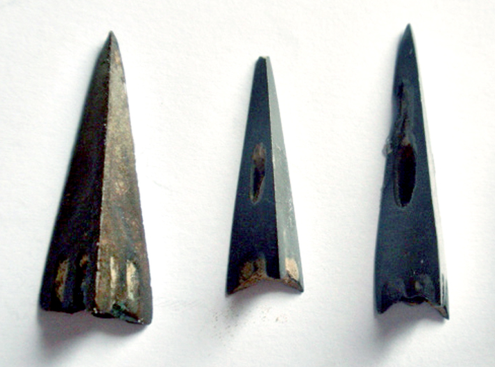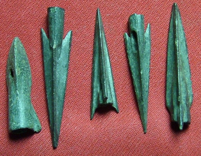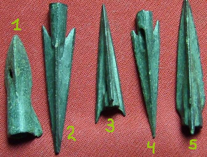 Скифские стрелы примерно 5-4 вв. до н.э. Крайние справа из оловянистой бронзы (цвет неправильно передан фотоаппаратом).