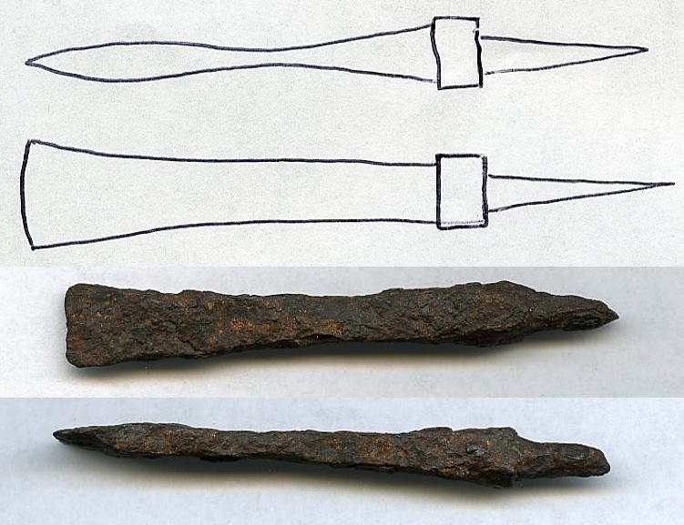 Может кто знает и ответит? Что это за странный долотообразный наконечник? Железо, 6,5 см длинной, север Манчжурии. Возможно хвостик прогнил и частично отвалился (на глаз он выглядит несколько коротковатым), тогда он был изначально длиннее на сантиметр-два. Можно ли его как то датировать? И каково его назначение? Это какой то специальный охотничий причиндал или боевой для какой то особой задачи? В сети нашел кучу фотографий подобных (правда по картинкам не ясно по большей части каковы они в сечении), но нигде не добрался до осмысленного текста. И для чего так было убиваться, делать его ланцетовидным в сечении? В руках он выглядит значительно приятнее чем получился на скане, сорри. Вложенные эскизы изображений |