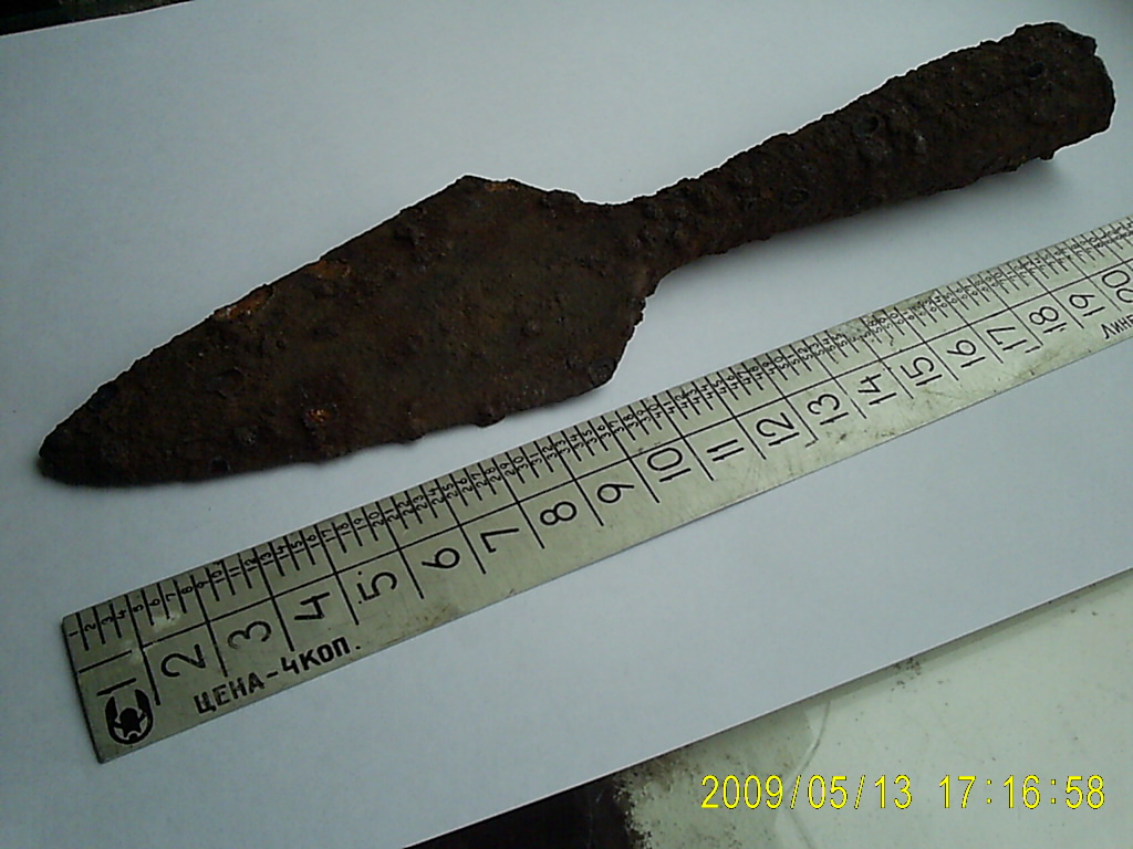 Впервые в этой теме увидел такое разнообразие наконечников, но к сожалению не нашёл похожего на недавнюю находку своего сына. Материал железо, длина 21см, наибольшая ширина ромбовидного лезвия 5см, длина лезвия 11см до шейки. Отверстие под древко 25х20мм, (вроде не деформированное) Шов втулки сделан встык без перехлёста с небольшим в виде трещины зазором. Стык просматриывается на фото (по центру втулки) Мы с сыном подумали, что это какой то свежий наконечник, так ли это? И представляет ли этот наконечник какую либо ценность? Сохранность хорошая одна сторона относительно гладкая, мы его не чистили, может быть заодно подскажете каким наиболее щадящим способом привести эту находку в хороший вид? Наконечник найлен в Навлинском районе Брянской области в песке на глубине 15см. Спасибо. Вложенные эскизы изображений |