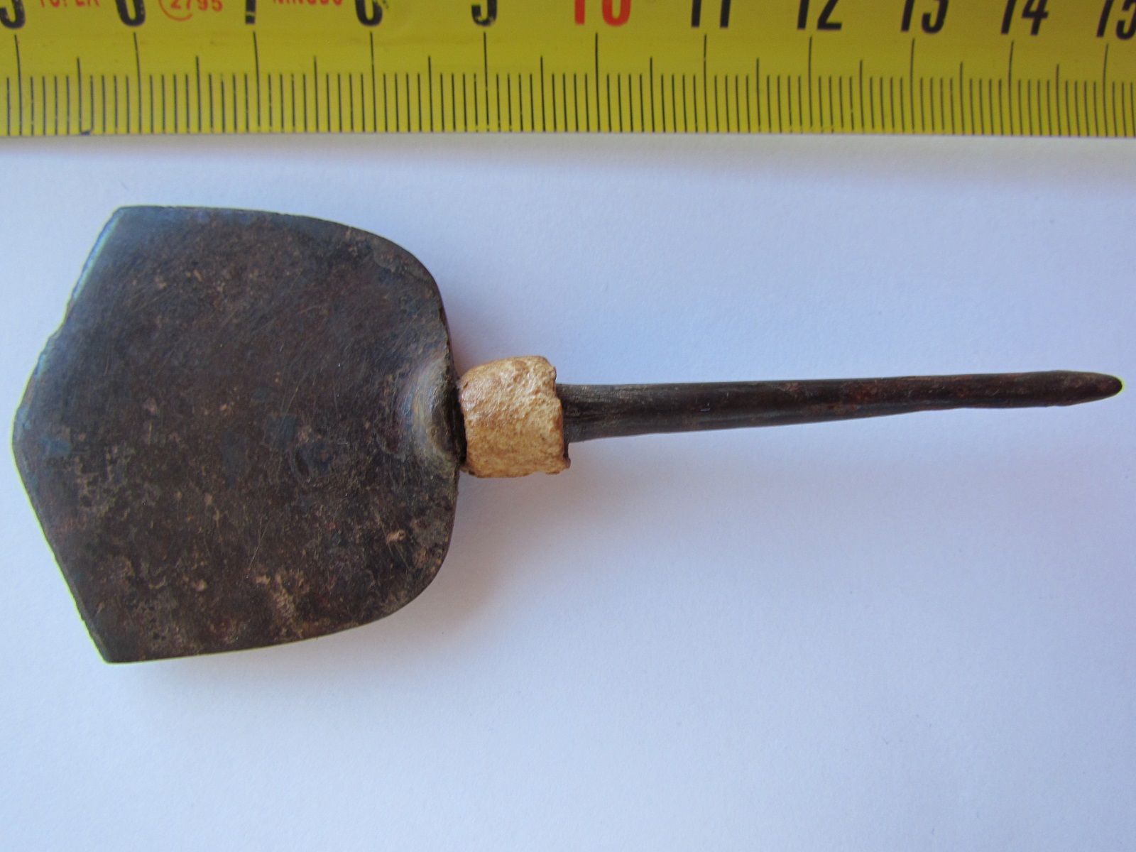 QUOTE(shabanov @ Mar 20 2012, 17:24) Всем добрый вечер, перебирал свои находки обнаружил сей предмет. Материал наверное бронза. Размер 10 на 4,5 см, толщина у основания 3см, вниз сужается, довольно увесистый. Как мне кажется это топор, на том же месте нашел наконечник стрелы тоже бронзовый. Место находки Алтай. Скорее всего-это не топор а бронзовое тесло. Но эпоха несомненно та же. -------------------- Делитесь знаниями-это путь к бессмертию!