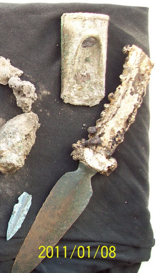 QUOTE(shabanov @ Mar 21 2012, 12:21) А вот этот кинжал, я выменял у односельчанина говорит достался по наследству. Я уже позже надел на кинжал ручку из рога. Рядом наконечник стрелы который я нашел на месте где было ранее найдено тесло. Нож с упором эпохи поздней бронзы. Недавно проходил подобный,всё спорили :кто говорил-нож а кто то говорил.что наконечник метательного оружия типа дротика.Остановились на ноже. Сообщение отредактировано scorpel: Mar 21 2012, 11:58 -------------------- Делитесь знаниями-это путь к бессмертию!