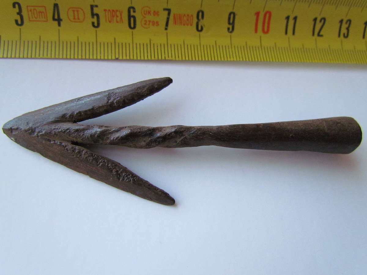 Найден сей втульчатый,двушипный наконечник стрелы (железо) 9 век Н.Э. К.Р. славяне под г.Сокиряны,Черновицкой обл.,Украина.
