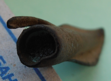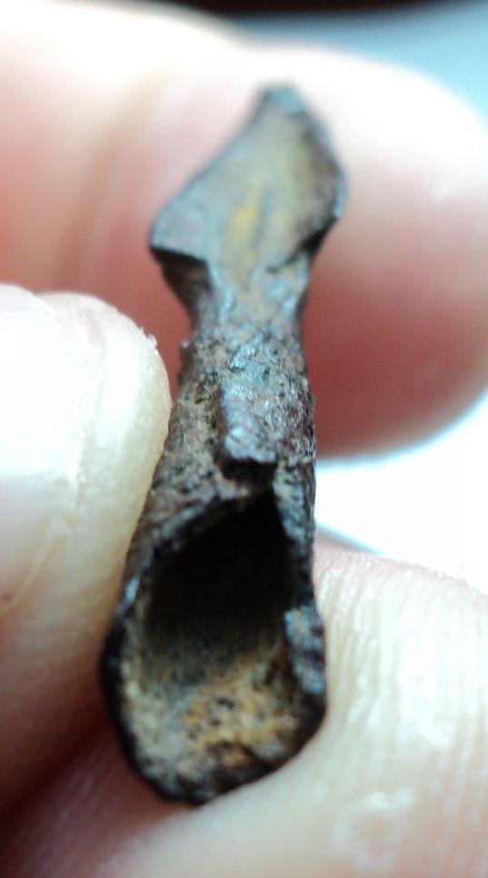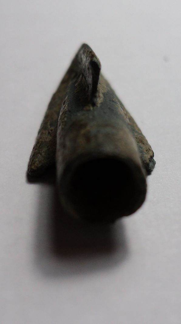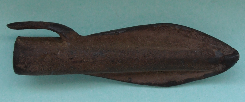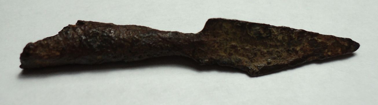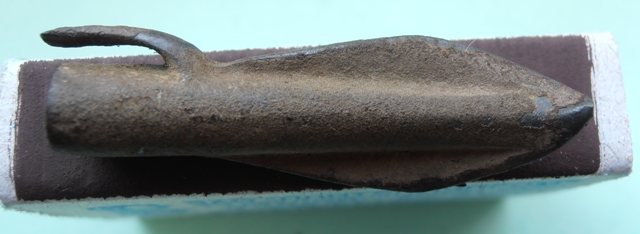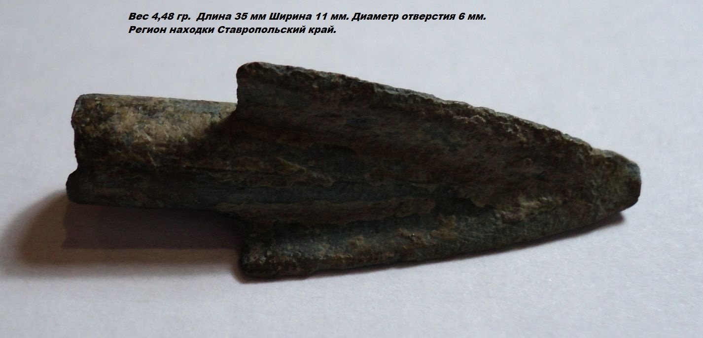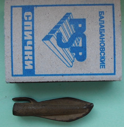 А вот первый мой в жизни наконечник. Железо, трехлопостной. Поднят в Ставропольском крае, близ села Михайловки. Сопутка полкопейки советов, гильзы. Другой комрад поднял глубо в окопе бронзовый наконечник, но я тогда им не заинтересовался почему то. Мой был на глубине сантиметров 10. Вес 1,89 гр. Длина 415 мм, ширина 6 мм. Диаметр отверстия 5 мм.