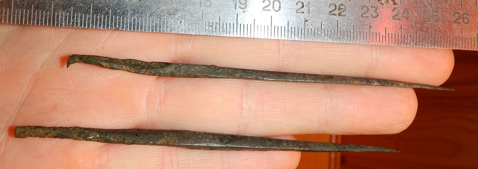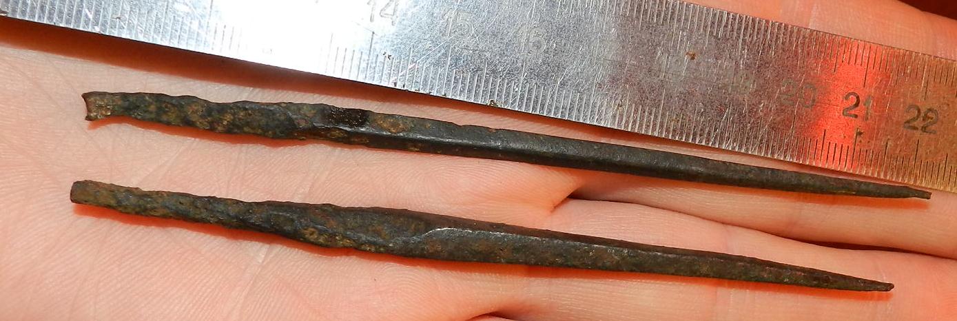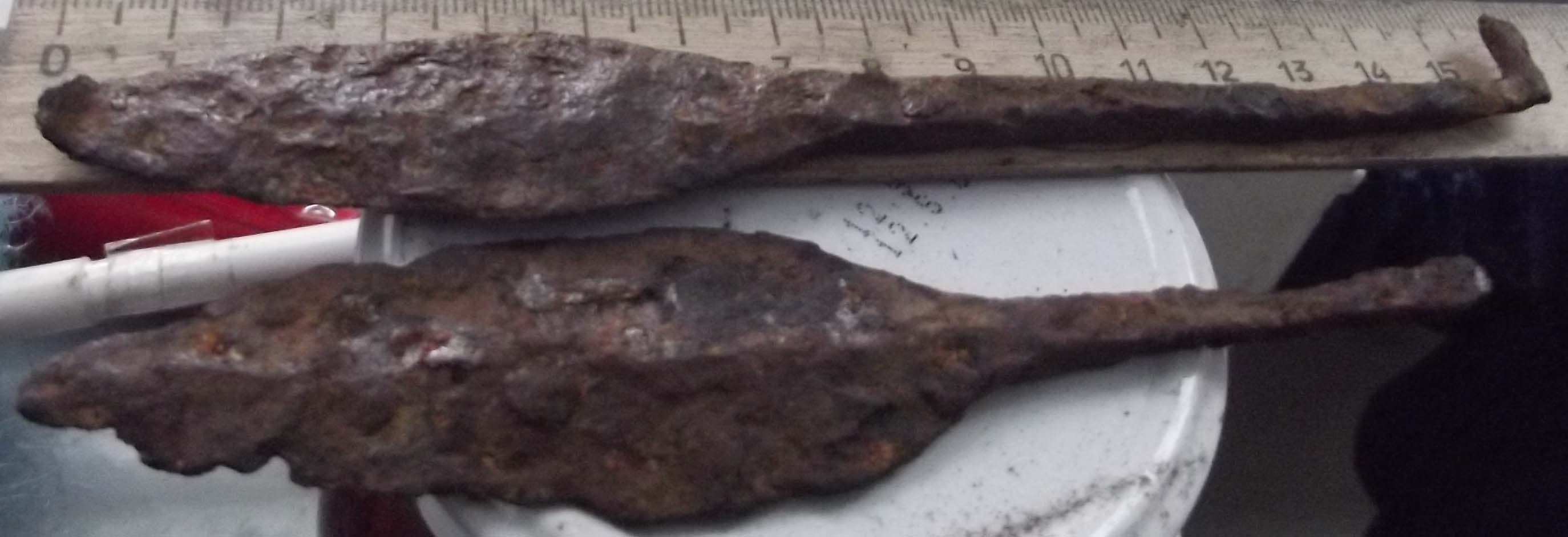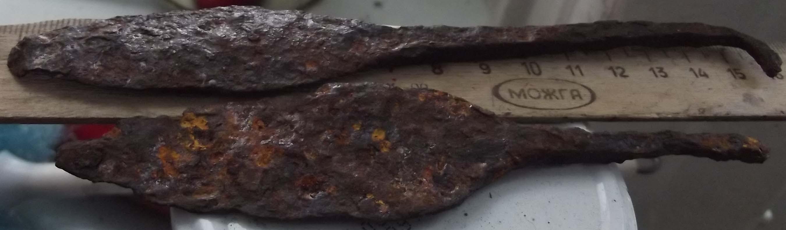 QUOTE(serkarn @ Mar 21 2013, 22:44) Второй от линейки точно наконечник, а первый ближе к шилу,но дело втом, что много наконечников попадаются не симметричные проще говоря не казистые, скоре всего делались из-занеобходимости на скорую руку. По форме приблизительно похож на боевой ,но намека на черешок нет ,упора нет ,значит не нак все же . QUOTE(Yorik @ Mar 21 2013, 22:59) Оба предмета точно вставлялись в дерево. По периоду- аланы. А вот что это... Сошлись во мнении что вероятно шило ,проколка , конечно как вариант что то метательное но вряд ли -------------------- Откопаю за вас клад! Недорого! Анонимно!
