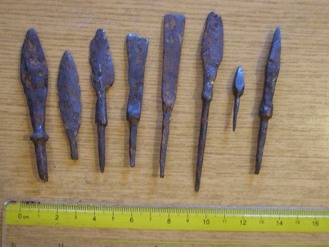 Помогите, пожалуйста, определить и датировать наконечники. Найдены в лесу, северо-запад моск обл, все лежали в радиусе 7-10 м друг от друга. Расширяя радиус поиска вокруг места их обнаружения, нашел 2 целых ножа, обломков ножей штук 7, замок (датируется от домонгола до 15 в и фрагменты замков, большой крючок, обломки мелкого железа, что-то типа долота, а так же большой кусок крицы Так же очень интересует, почему эти 8 наков разных типов лежали в одном месте - явно не потеряшки, может, ритуального значения? При раскопке попался фрагмент керамики, было много камней, что для грунта для этого леса несвойственно... Вложенные эскизы изображений -------------------- ВНИМАНИЕ!!! МОЙ АККАУНТ БЫЛ ВЗЛОМАН!!! НИКАКИЕ СДЕЛКИ ОТ МОЕГО АККАУНТА НЕ ДЕЙСТВИТЕЛЬНЫ!!!!