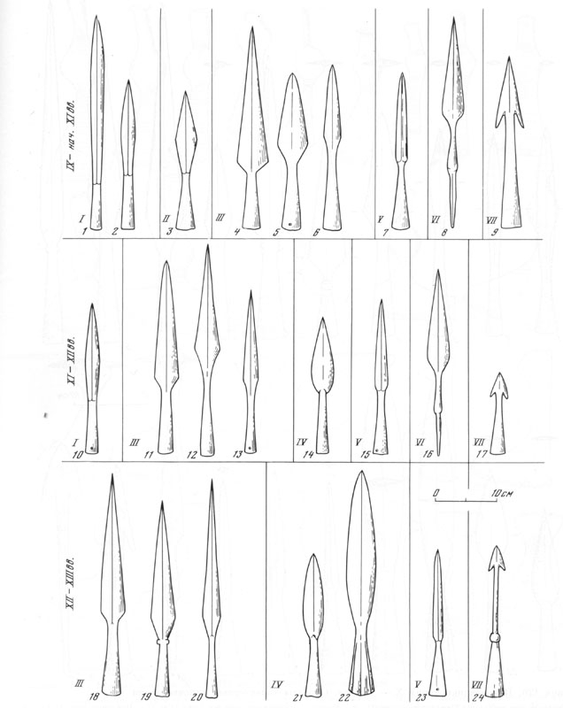 QUOTE(Eskalibyr @ Oct 31 2015, 22:02) Наконечники 2 и 4 классифицированные как стражников в некоторых источниках проходят в перечне вооружения монгольского воина! Читаем про этот тип: QUOTE Удлиненно-ромбические с кольцевыми завитками. Включает 1 экземпляр из восточного Забайкалья. Длина пера -12 см, ширина пера — 4 см, длина втулки — 16 см. Наконечник с остроугольным острием, пологими плечиками, кольцевыми завитками с обеих сторон, конусовидной втулкой со сквозным округлым отверстием для крепления к древку (Рис. I, 8). т.е. 17-18 вв. Подобные копья в эпоху позднего средневековья применялись енисейскими кыргызами и телеутами, находившимися в военно-политической зависимости от джунгар. |