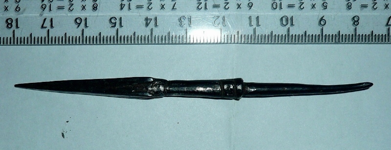 QUOTE(Дядюшка Сэм @ Dec 10 2017, 15:41) Приветствую !!! Подскажите по этим вещам . №1 Очень похож на наконечник копья с обломанным черешком или втулкой ? Если это так , то если не сложно киньте фотографию целого для наглядности буду думать как восстановить . 10 см длинна макс ширина 4 см . Спасибо . Доброго! 1. По одному фото трудно судить - с черешком или втулкой, нужно знать профиль самого наконечника, толщину и профиль металла в районе слома... пока, похож на небольшую черешковую сулицу. 2. На втором фото, что-то похожее на наконечник, но судить не берусь - нужна хотя бы минимальная расчистка. 3. Наконечник типа 43, по тому же Медведеву. Ромбовидные с расширением в середине длины пера и пропорциями пера 1:3 "Длина 70— 115мм, длина пера 35—78мм, ширина пера 13—25 мм, вес 5—11 г. Были распространены с IX до середины XIII в. Особенно характерны для XII и первой половины XIII в." -------------------- Правительство у нас хорошее, это с народом ему не везёт!