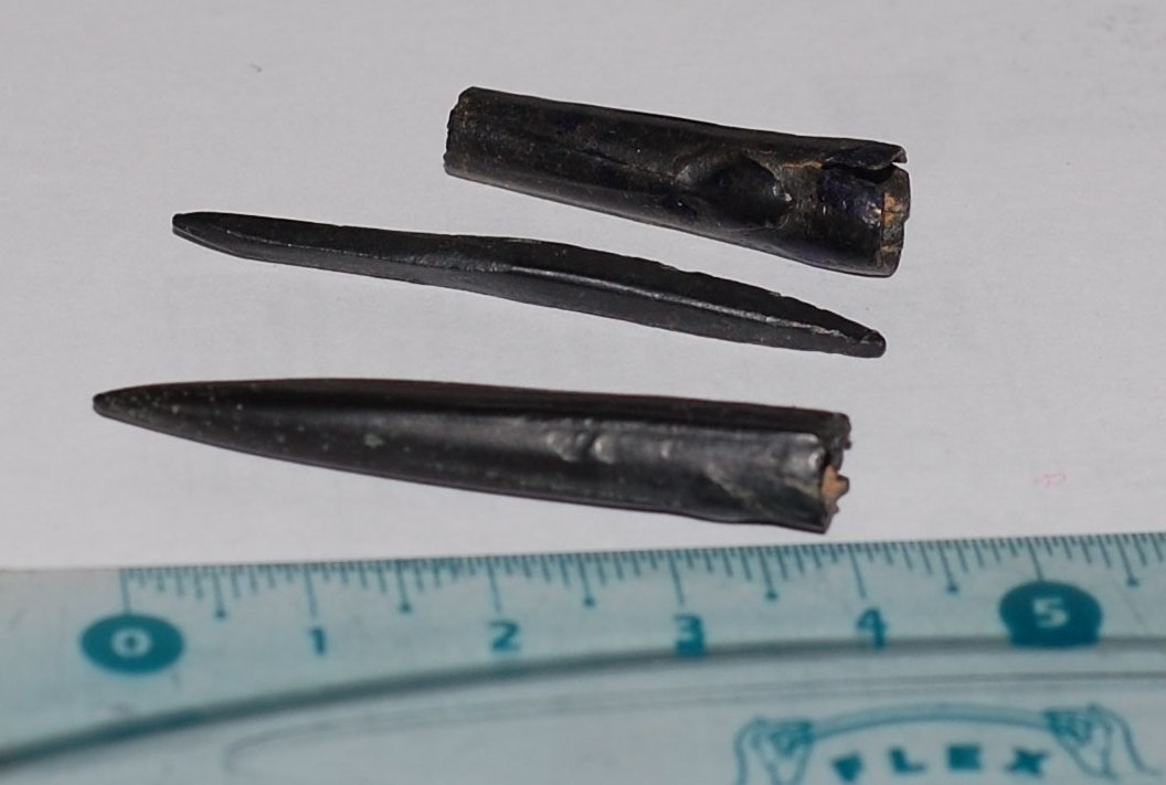 Прошу подсказать, как назывались такие наконечники.Таких больше не встречалось.Круглые какие-то, хотя грани просматриваются и вроде обломаны концы(не знаю как называются, отростки что-ли). У одного нос отломан.А посередине (на фото с линейкой) это игла?С разных концов разная в объеме и один из кончиков тоже кажется отломан.