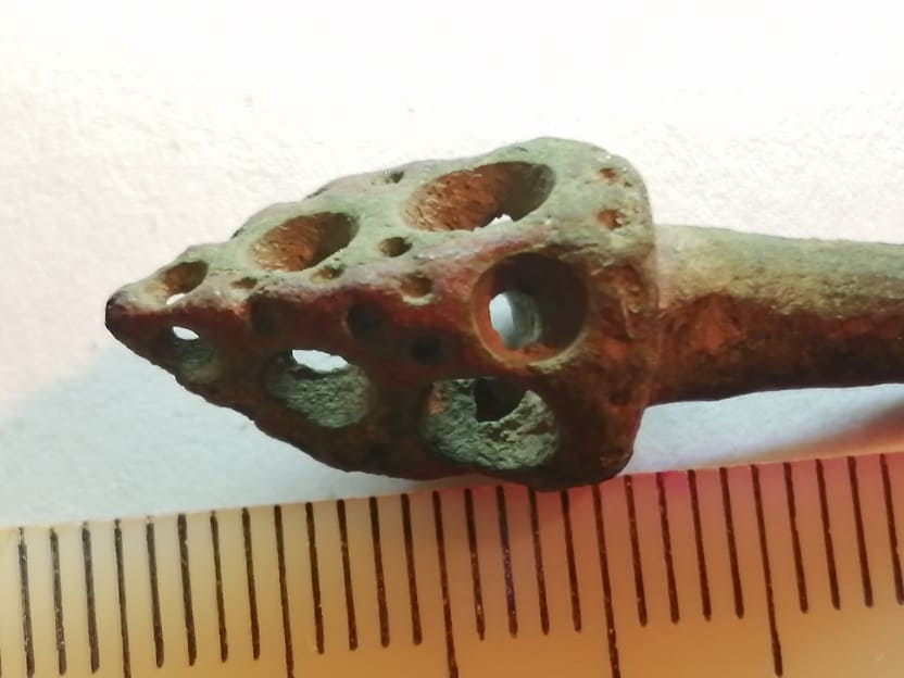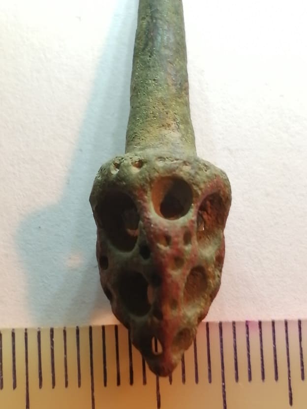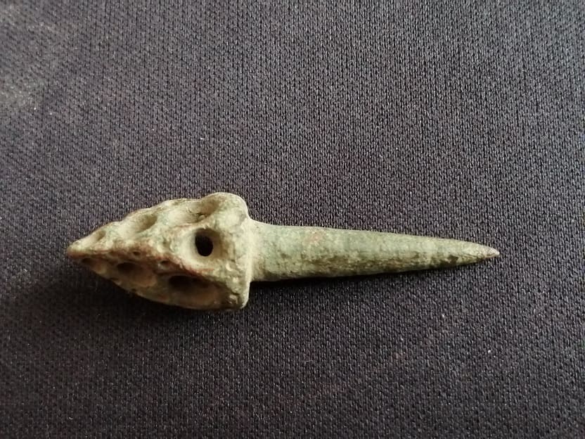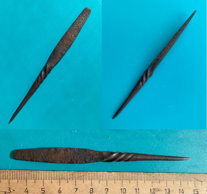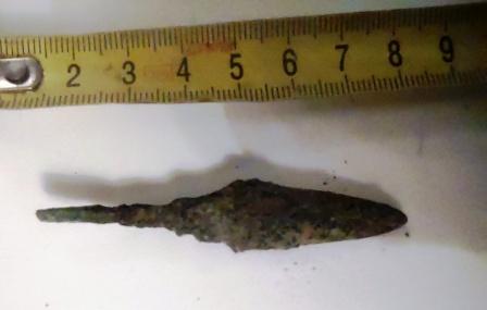Всех приветствую. Подскажите пожалуйста по наконечнику. Чей, период? Ранее не встречал по ФУ таких и вот на тебе. Длина 5 см., Ширана 12-13 мм. Из сопутки чешуя МФ, Медная какая-то, перстни, обычные железные наки. Юг Нижегородской области.