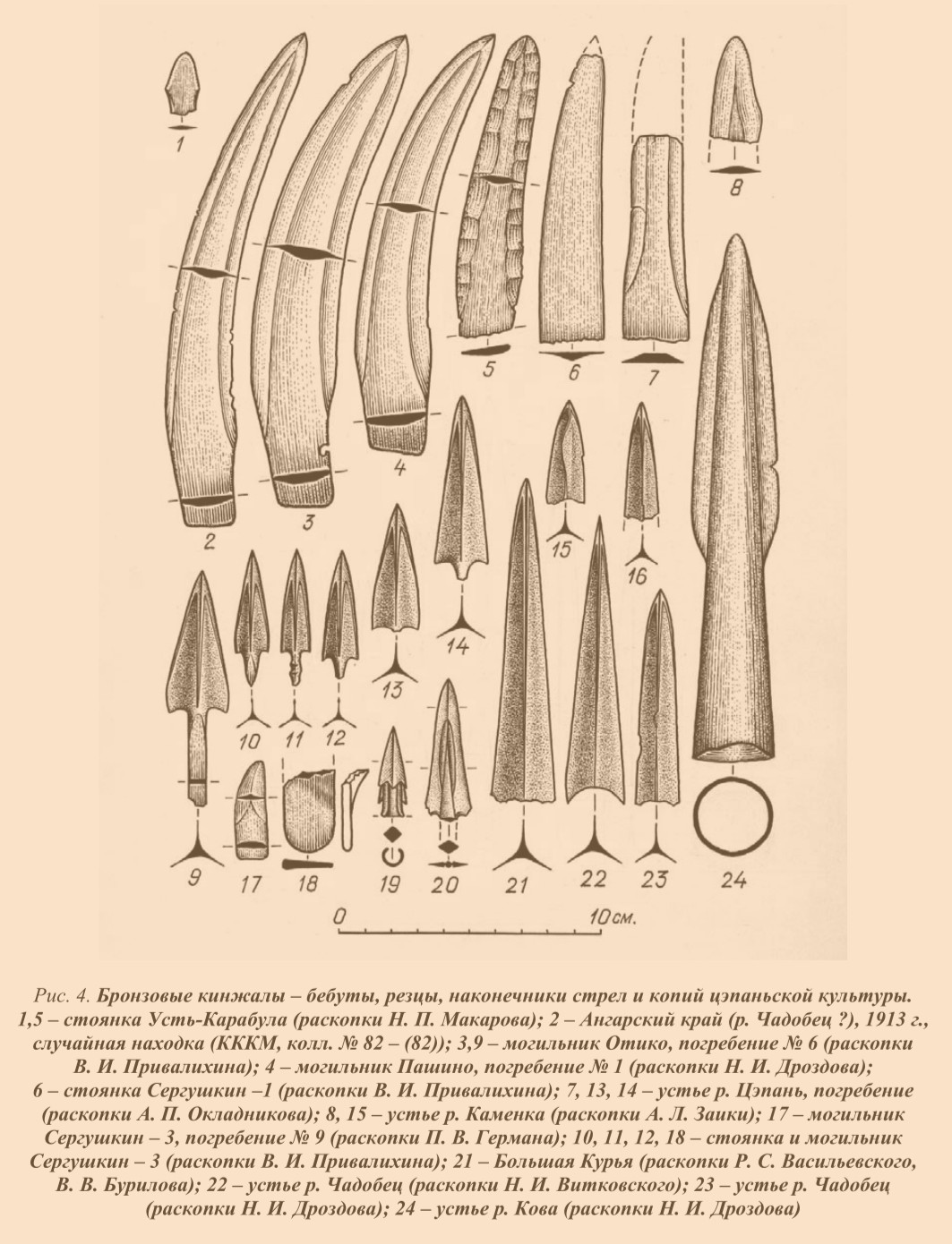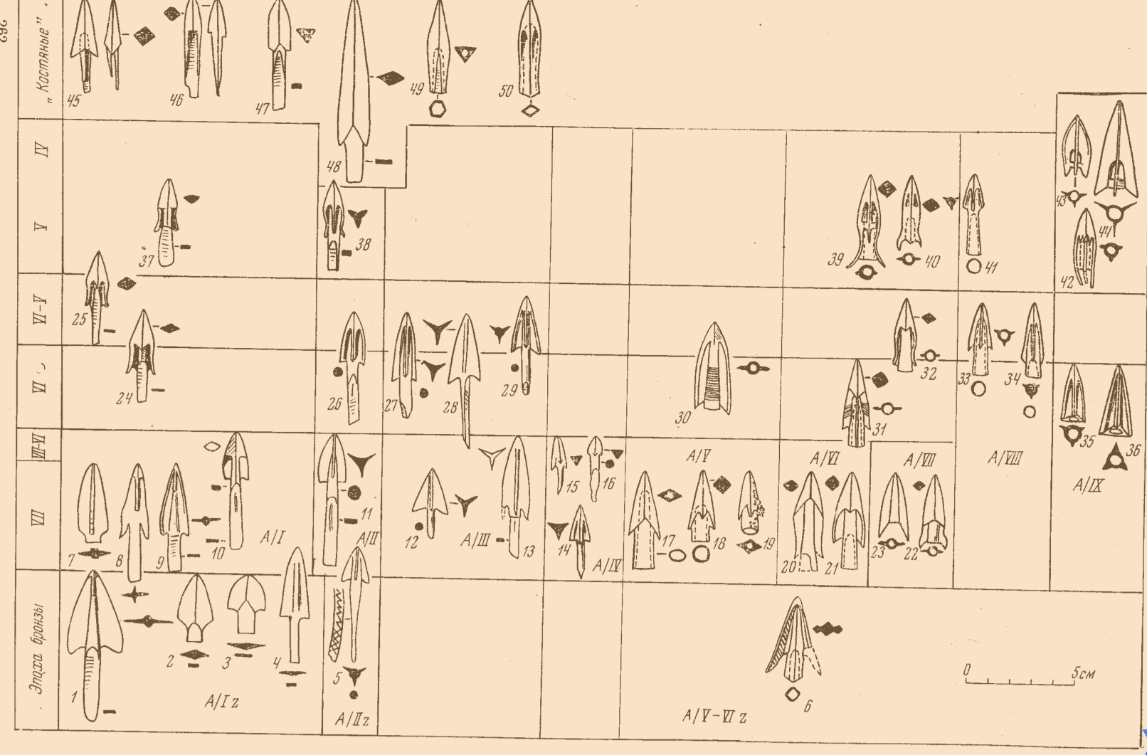 плоские двухлопастные черешковые-тагарские 7-6 вв. до н. э., трехлопастной безнасадный-цэпаньский 6-5 вв. до н. э. |