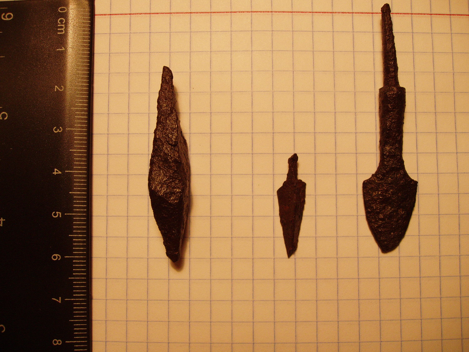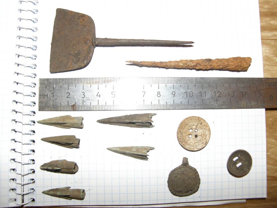 вот мой первый сезон проходит...... сверху железные наконечники правда ещё один забыл трехгранный. потом нож первый у него кольцо медью паеное, а у второго золотом, это старательский нож я его в старательской закапухе нашел примерно см70-80 глубинной в земле был в вертикальном положении. а медальен незнаю чей...