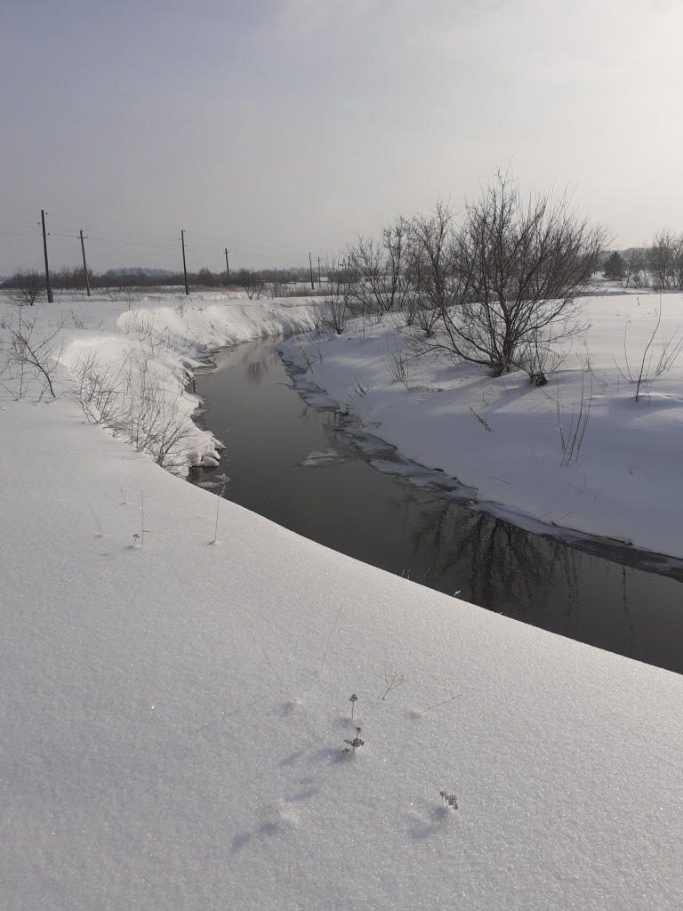 Снега много,речка под окном ,зимой не застывает течет .Плавают только утки да бобры.