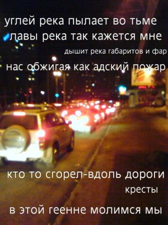Чёрный город чёрные улицы чёрные окна белые люди на спинах мишени а на лицах усталость никто не знает сколько жить им осталось Покрытые пеплом покрытые пылью стены и стёкла в багровом закате и в городе этом висит напряжение никто не знает проблемы решение... -------------------- Было у матери три сына...двое нормальных,а третий...копарь - партизан.