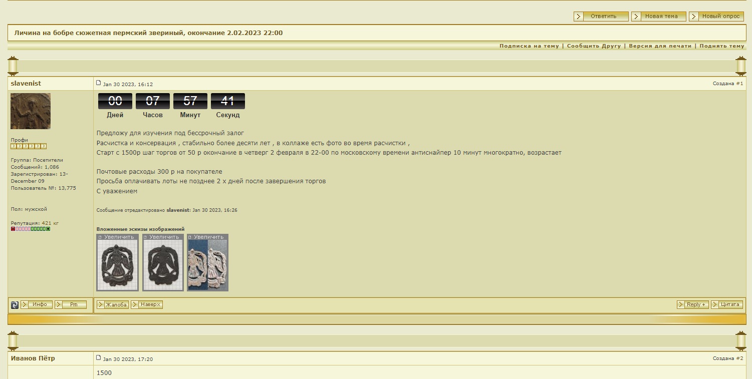 я с ним не согласен , - по предмету с аукциона - ни разу нигде , не в новоделах ,не в сувенирах такого не встречал , не 10 лет назад , ни разу ничего , хотя странно если бы он был , то в интернете где нибудь или на мешке что то хоть раз но показалось . интересно посмотреть бы .. - по всаднику с сайта по пзс, Википедии и книге Эренбурга , считаю что он оригинал , я его видел вживую просто - по семейке , фото хоть и сжатое , но видно все хорошо - по птичке , на сайте это тот же предмет . по патинне черно зелёной которая обычно на медных предметах , бывает и на серебре такая ( много просто приходилось самому открывать) от состава сплава зависит , серебро низкопробное естественно ,вот пример Сообщение отредактировано slavenist: Feb 2 2023, 21:49 Вложенные эскизы изображений |