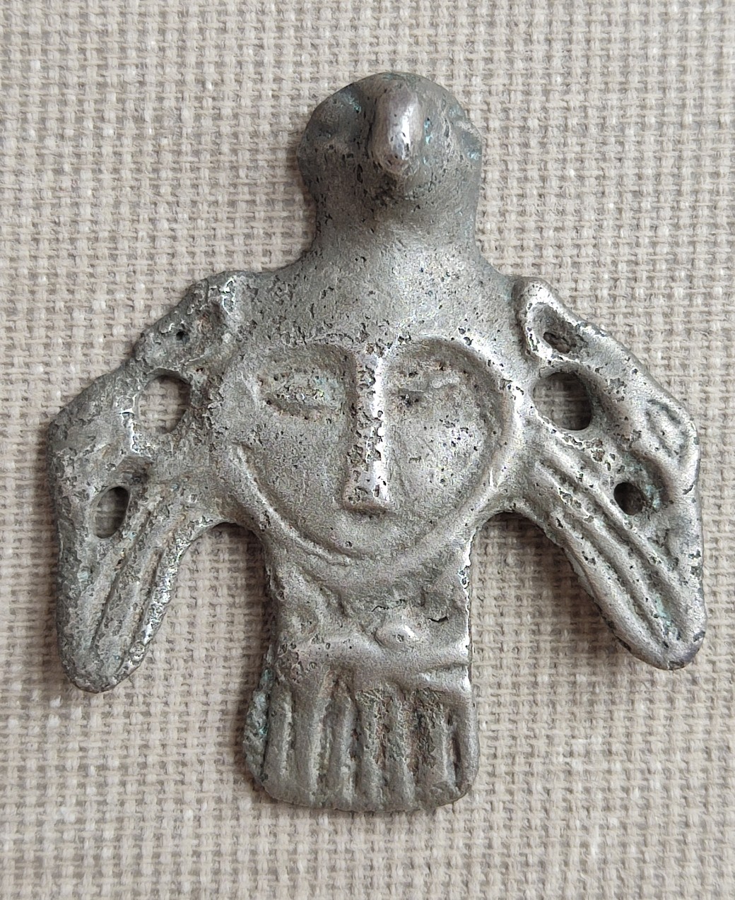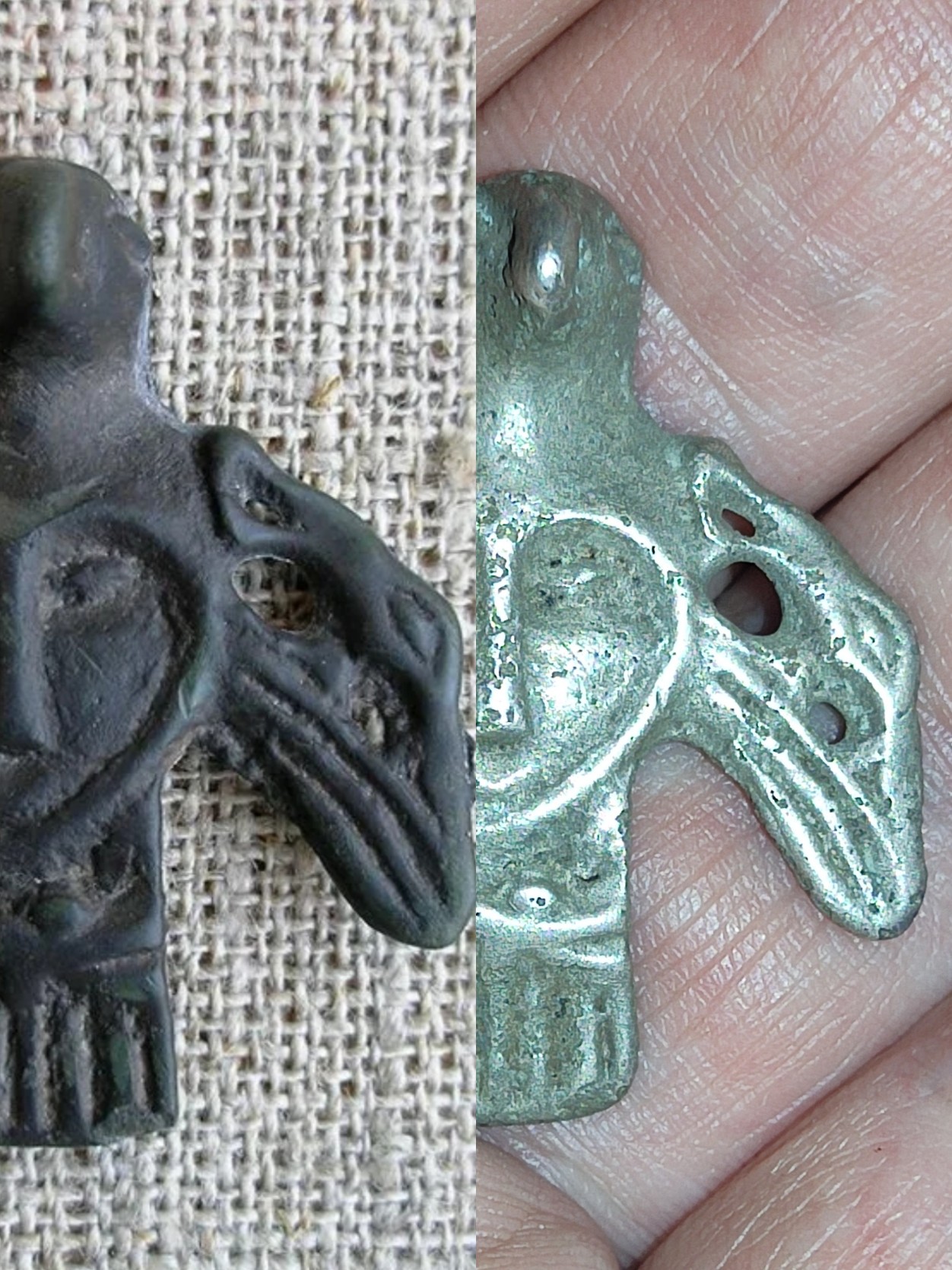 Птичка в патине, явно бронзавая и настоящая. Даже коцаная лопатой. Переливок с неё в серебре-фуфло.