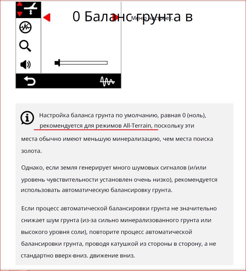 Скорее всего, имеется в виду вот эти рекомендации стр. 54 официального Руководства (подчеркнуто красным). Из корявого машинного перевода, можно предположить, что в режиме поиска All‑Terrain (вездеходный) на грунтах с малой минерализацией БГ можно ставить в 0 Вложенные эскизы изображений |
