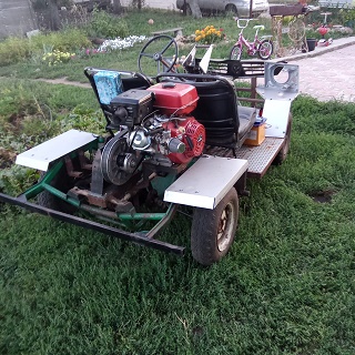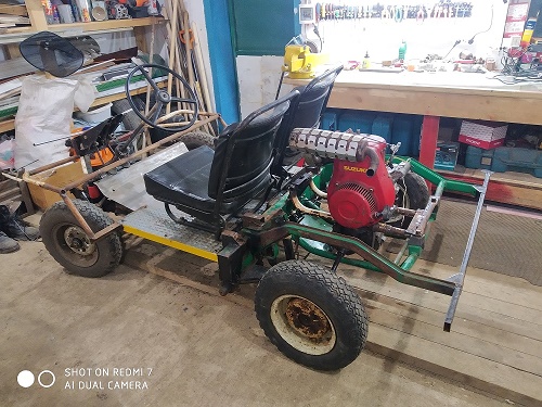 Приветствую всех! Всё же я добился своего, аппарат на ходу. Двигатель поменял на более современный, оборотистый от Лифан, 15 сильный с вариатором Сафари. Намастырил кое какую облицовку, внешний вид вроде появился. Скорость в приделах 60 км.ч., в горку тащит троих мужиков только в путь.