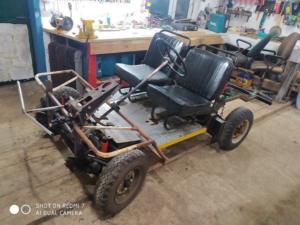 Приветствую всех. Бензин дорожает, запчасти на авто тоже. Решил собрать простое багги из металлолома и частей разной техники. За основу взял передний мост с рулевой рейкой и заднюю раму с торсионами от ЗМЗ "инвалидки" по простому. Сварил их между собой рамой из квадратной старой трубы, сиденья от УАЗа, блок педалей от копейки, мотор от мотоблока 11 л/с. Проект пока на стадии установки двигателя через центробежное сцепление к редуктору. Хотел поставить вариатор типа "САФАРИ", но дороговато, может быть в будущем.