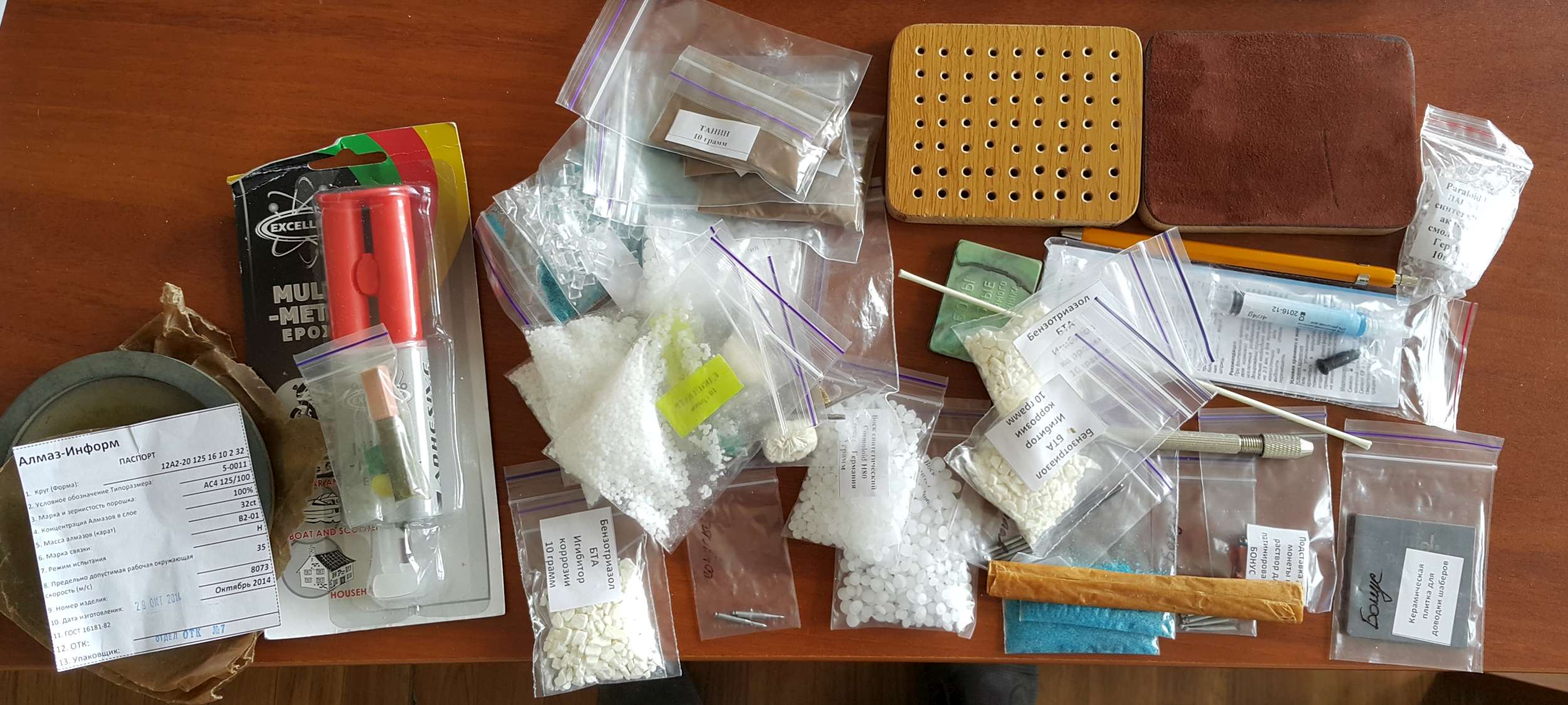 Сейчас цена составляет: Паралоид Б72 (Кремер, Германия) гранулы 10грамм-30руб. Космолоид Н80 (Кремер, Германия) гранулы 10грамм-30руб. Цанговая ручка-держатель (Кохинор ,Чехия) - 280 руб. Полный заказ может выглядеть так: 1. Набор шаберов из надфилей (СССР) (5шт.) - 180руб. 2. Набор шаберов из боров (СССР) (5шт.) - 180руб. 3. Набор шаберов из победитовых стержней(5шт.)-220руб. 4. Набор шаберов из твердосплава (5 шт.) - 290руб. 5. Устройство для заточки вручную - 400 руб. 6. Алмазная тарелка на мотор, для заточки инструмента -600руб. (рекомендую, уточняйте какой диаметр вала на Вашем моторе) 7. Цанга двусторонняя - 180 руб. 8. Цанговая ручка-держатель (Кохинор ,Чехия) - 280 руб. 9. Гладилку конус 40 рублей (2 шт.) разного размера -80 руб. 10. Марганцево-купоросная патина, пакет на 100мл. воды-40 руб. 11. Паралоид Б72 (Кремер, Германия) гранулы 10грамм-30р (корректируйте количество) 12. Космолоид Н80 (Кремер, Германия) гранулы 10грамм-30р (корректируйте количество) 13. Латунные (стальные) щетки для чистки и полировки (под бормашинку) 1шт. -40руб. 14. Кисточка стекловолоконная (под обжиг) 1шт. - 30 руб. 15. Рабочий столик - 120 руб. (см. в теме) 16.Подставка для инструмента -120 руб. (см. в теме) 17.БТА (бензотриазол сухой) 10гр. – 20 руб. Готовый раствор (100 мл.) -80 руб. 18.Клей двухкомпонентный, для доделки – 300 руб. 19.Пигменты для клея (цветные) 1шт. - 40 руб. 20.Керамическая плитка, для доводки шаберов- 40 руб.(к полному заказу добавляю бонусом) 21.Гель травильный(для чистки серебра) – 80 руб. Для чистки железа: Танин 10 грамм -25 руб. Едкий натр 10 грамм – 25 руб. Пересыл 200-400 руб. (зависимо от веса химии и наличия тарелки) Микроскопы: ST60 24B2 – 290у.е. (цена с пересылом, уточняйте курс) ST60 24B1 – 240у.е. (цена с пересылом ,уточняйте курс) без подсветки, могу установить подсветку +1000руб.- НЕТ В НАЛИЧИИ К любому микроскопу добавляю бонусом : набор шаберов из надфилей плюс пакетик с БТА Оплата на карту Сбербанка России . Отправка инструмента почтой России. -------------------- Если Бог за тебя,то какая разница,кто против тебя.