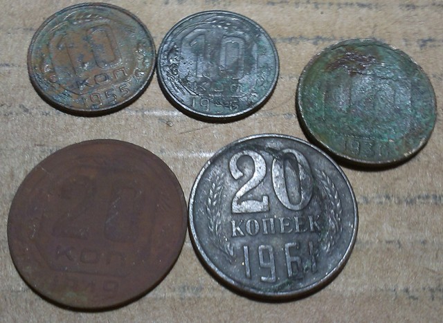 Всем доброго дня. На фото 5 монет разные сплавы и разные налеты. Если кто может дать совет какой налет чем чистить буду очень благодарен.