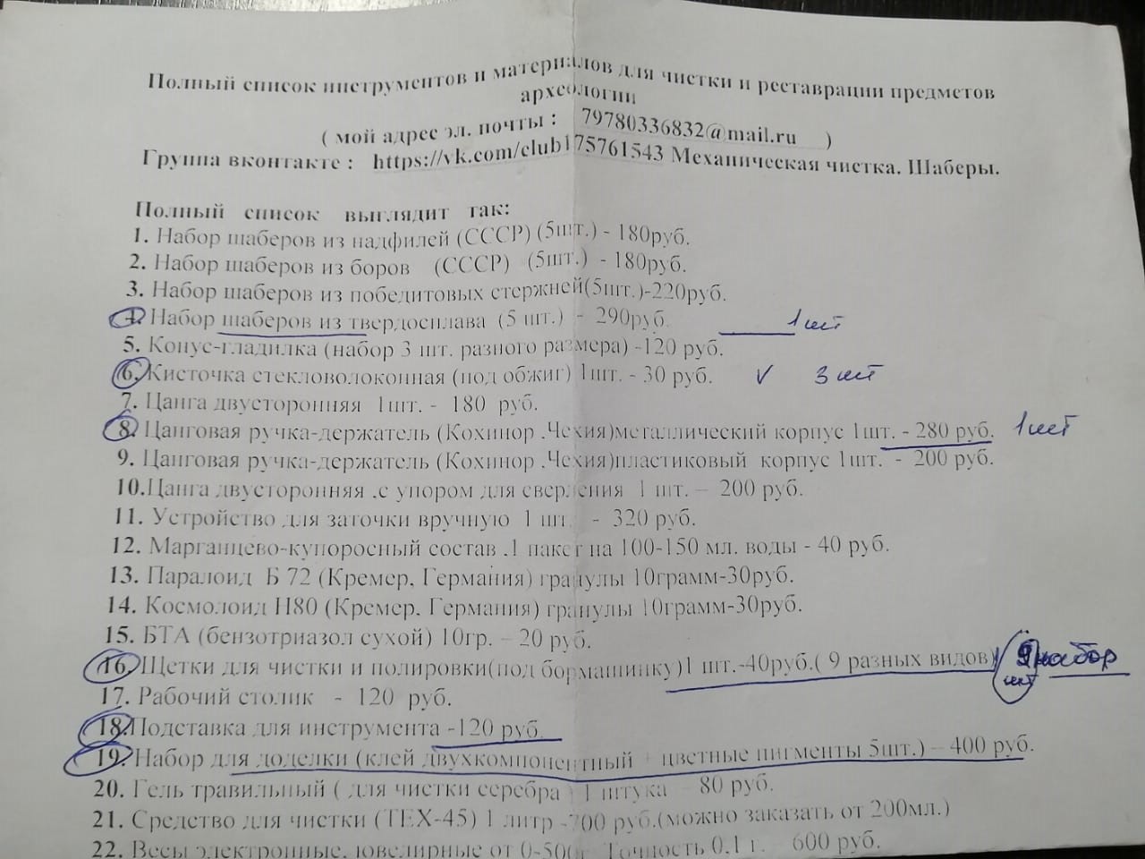 1. Набор шаберов из доводочные Швейцария (5шт.) - 220руб. 2. Набор шаберов из боров (СССР) (5шт.) - 180руб. 3. Набор шаберов из победитовых стержней(5шт.)-220руб. 4. Набор шаберов из твердосплава (5 шт.) - 290руб. 5. Конус-гладилка (набор 3 шт. разного размера) -120 руб. 6. Кисточка стекловолоконная (под обжиг) 1шт. - 30 руб. 7. Цанга двусторонняя 1шт. - 240 руб. 8. Цанговая ручка-держатель (Кохинор ,Чехия)металлический корпус 1шт. - 280 руб. 9. Цанговая ручка-держатель (Кохинор ,Чехия)пластиковый корпус 1шт. - 200 руб. 10.Цанга двусторонняя , с упором для сверления 1 шт. – 250 руб. 11. Устройство для заточки вручную 1 шт. - 380 руб. 12. Марганцево-купоросный состав ,1 пакет на 100-150 мл. воды - 40 руб. 13. Паралоид Б 72 (Кремер, Германия) гранулы 10 грамм – 60 руб. 14. Космолоид Н80 (Кремер, Германия) гранулы 10 грамм – 60 руб. 15. БТА (бензотриазол сухой) 10гр. – 20 руб. БТА (готовый раствор) – 200мл. – 150 руб. 16. Щетки для чистки и полировки(под бормашинку)1 шт.-40руб.( 9 разных видов) 17. Рабочий столик - 120 руб. 18.Подставка для инструмента -120 руб. 19. Набор для доделки (клей двухкомпонентный + цветные пигменты 5шт.) – 400 руб. 20. Гель травильный ( для чистки серебра ) 1 штука – 90 руб. 21. Средство для чистки (ТЕХ-45) 1 литр -700 руб.(можно заказать от 200мл.) 22. Весы электронные, ювелирные от 0-500г. Точность 0,1 г. – 600 руб. 23. Алмазная тарелка на мотор, для заточки инструмента -700руб. (рекомендую, уточняйте какой диаметр вала на Вашем моторе) 24. Алмазный заточной брусок двусторонний (заточка/доводка) - 1150 руб. Для чистки железа: 25.Танин 10 грамм - 30 руб. 26.Едкий натр 10 грамм – 20 руб. Для микроскопа: 27. Наглазники, резиновые и глубокие, подходят на многие модели микроскопов в том числе МБС 9-10.Внутренний диаметр 33 мм. Цена - 300 руб.(пара) Пересыл 100-400 руб. (зависимо от веса посылки) Микроскоп : ST60 24B1 – 15500 руб. (без подсветки) Устанавливаю подсветку – 1500 руб. Оплата на карту Сбербанка России . Отправка заказов почтой России. Для большего удобства составил два варианта готовых заказов: Вариант 1 Такого набора будет достаточно попробовать и понять что такое механическая чистка. Но для полноценной и качественной работы этого будет маловато. 2.Набор шаберов из боров (СССР) (5шт.) - 180руб. 3.Набор шаберов из победитовых стержней(5шт.)-220 руб. 4.Набор шаберов из твердосплава (5 шт.) - 290руб. 5.Конус-гладилка(набор 2шт.разного размера) - 80руб. 6.Кисточка стекловолоконная (под обжиг) 2шт.(разного диаметра)- 60 руб. 7.Цанга двусторонняя 1шт. - 240 руб. 12.Марганцево-купоросн.состав для патинирования- 1шт.- 40руб. 13. Паралоид Б 72 (Кремер, Германия) гранулы 10грамм-60 руб. 14. Космолоид Н80(Кремер, Германия) гранулы 10 грамм-60 руб. 15.БТА (бензотриазол сухой) 10гр. – 20 руб. 17. Рабочий столик - 120 руб. Пересыл 100 руб. Итого 1470 руб. Вариант 2 Вот такого набора достаточно пару лет плодотворно и качественно работать по чистке: 1. Набор шаберов доводочные Швейцария (5шт.) - 220руб. 2. Набор шаберов из боров (СССР) (5шт.) - 180руб. 3. Набор шаберов из победитовых стержней(5шт.)-220руб. 4. Набор шаберов из твердосплава (5 шт.) - 290руб. 5. Набор конусов-гладилок (3 шт.) разного размера -120 руб. 6. Кисточка стекловолоконная 2шт. - 60 руб. 7. Цанга двусторонняя 1шт. - 240 руб. 9. Цанговая ручка(Кохинор ,Чехия)пластиковый корпус 1шт.-200 руб. 13. Паралоид Б 72 (Кремер, Германия) гранулы 20грамм-120 руб. 14. Космолоид Н80(Кремер, Германия) гранулы 30 грамм-180 руб. 11. Устройство для заточки вручную 1 шт. - 380руб. 12. Марганцево-купоросный состав,1пакет на100-150мл.воды2шт-80р. 15. БТА (бензотриа