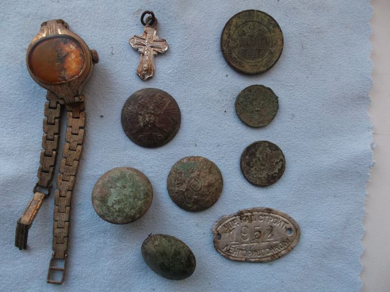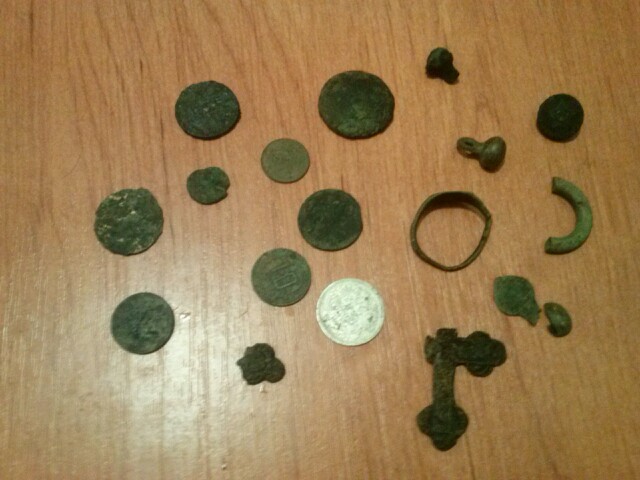 Здравствуйте, сегодняшний улов, восемь монет, несколько пуговиц, перстень с рисунком, среди монет попалась серебрушка царская, но обидно аверс утёрт вусмерть, а так в принципе доволен, компадре опять не подвёл.