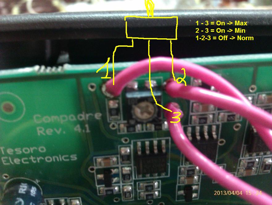 QUOTE(LapshinEvgeniy @ Mar 16 2017, 06:42) Выпаять нужно самое верхнее сопротивление 10 кОм, на фото рядом с надписью Compadre, провода припаиваем как на фото, есть три заводских отверстия под них, два верхних провода припаиваем на крайние выводы переменного резистора 10 кОм, нижний провод на средний вывод переменного резистора. |