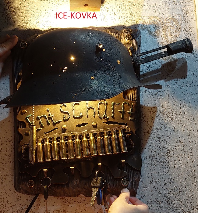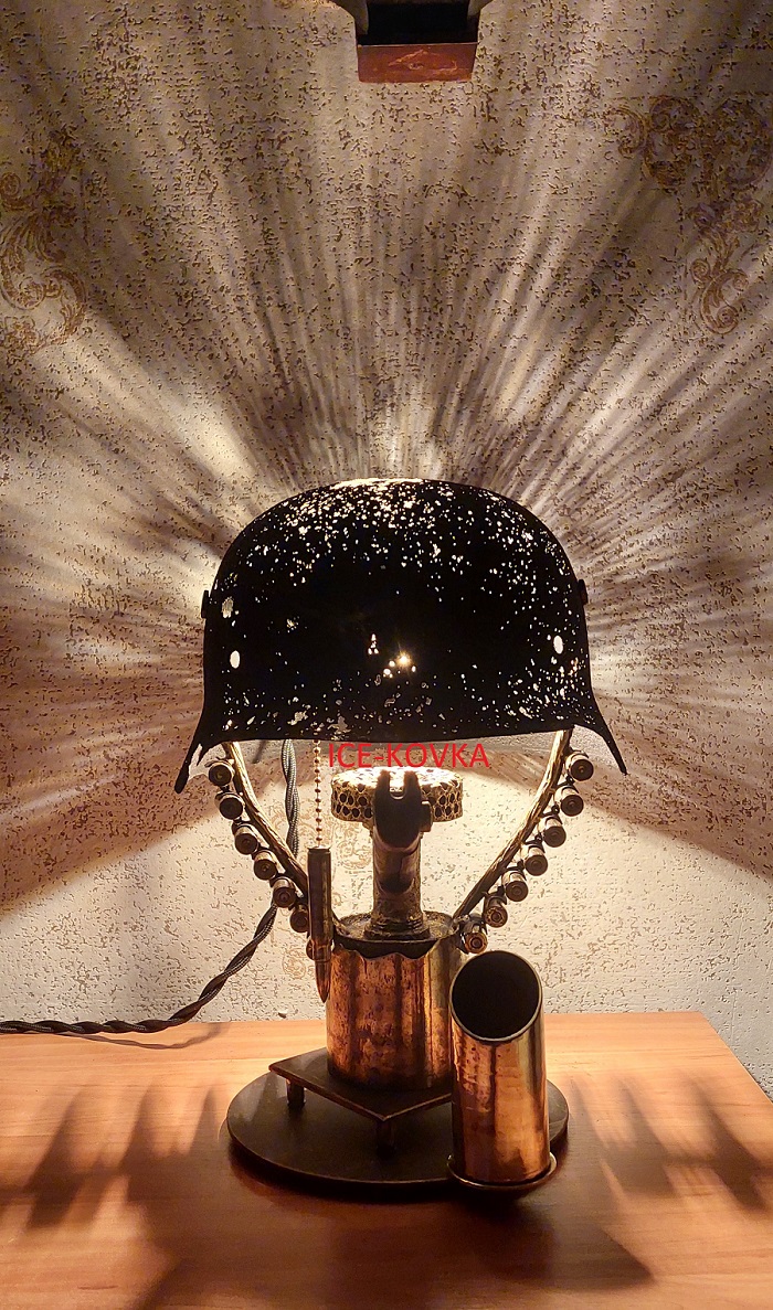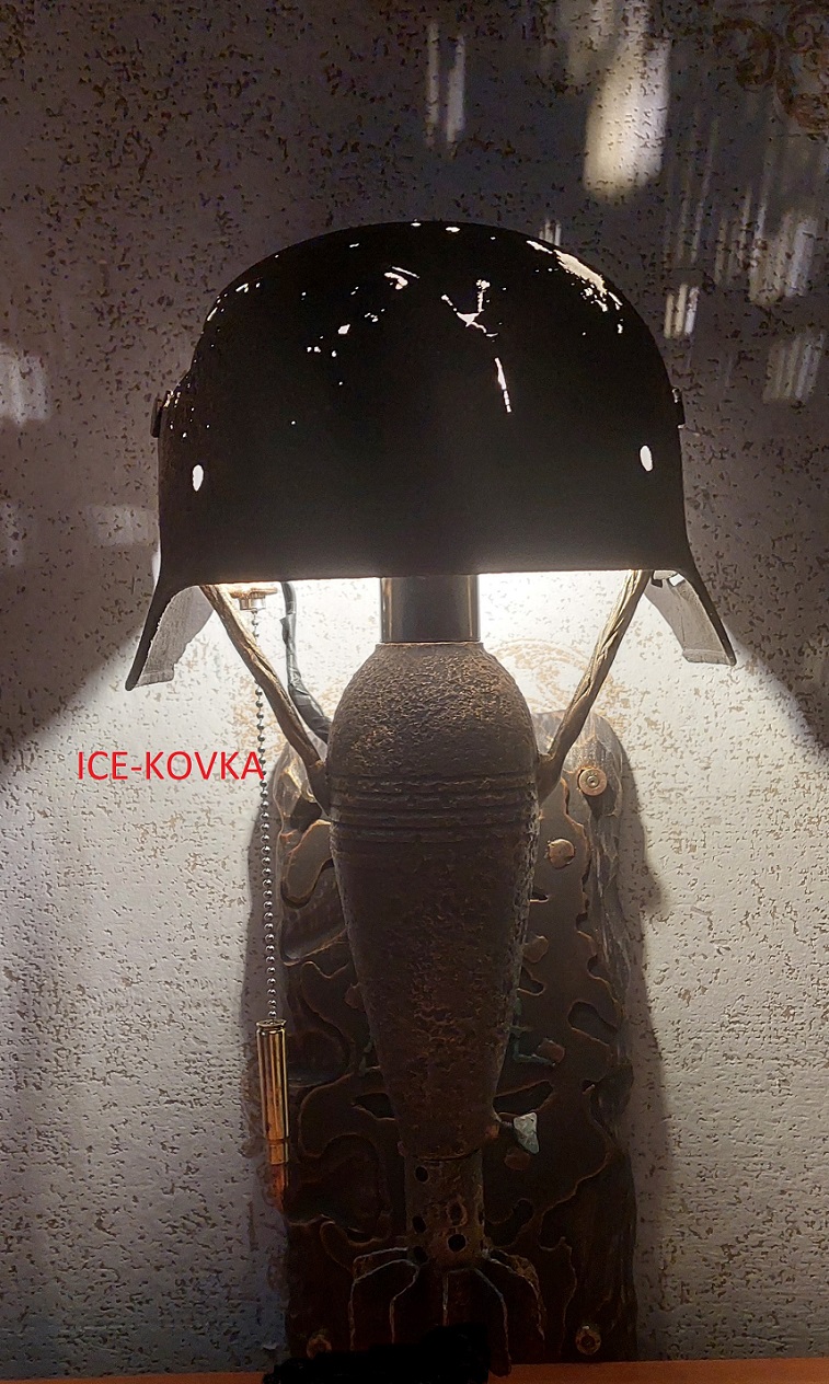Антуражный светильник ночник из немецкой каски и штыка к 98.стойку можно поворачивать в стороны.каска съемная и регулируется угол наклона.подставка для ручек из гильзы.штык составной и вынимается.включается дернув за макет патрона.все пустое.очень красиво светит.шнур в тканевой оплетке.20.000р+почта