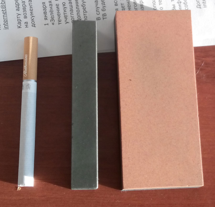 для грубой заточки это индиа. у меня кусок новодельный. ни какого винтажа 60 и более лет давности. куплен за копейки. и стерженёк байкалита квадратного сечения. притёр 4 стороны на разных порошках и всё. после индии топаем на самую грубую сторону бакалита. с десяток проводов, потом на сторону поглаже и так до самой тонкой. получается вполне рабочий инструмент. для реально грубой обдирки чтобы не мучатся с твёрдыми крупными заготовками на индии, можно пользовать грубый алмаз. до конца не дотачиваем. снимаем основное, а дальше на камене добиваем, потом на рыжую сторону индии и на байкалит по схеме. чо касается выше показаного транса. если транслючент хорошего качества и хорошо притёрт, то он даёт очень даже чистую кромку. однако есть и минусы. после индии замахаемся на нём тереть. особенно если плоскость большая. чтобы не убиваться, а руки то не казённые, всё же есть смысл промеж них что то ещё вставлять. для ускорения работы. вот фото моего скромного набора, который покрывает 99 процентов задач по заточке инструмента для расчистки монет и тп. -------------------- Неспешно куплю натуральные камни для заточки.