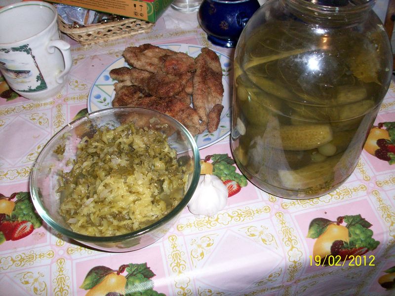 Мне после ночи бурной помогает вот такой рецепт: Мясо (лучше свинину) отбиваем как следует, солим, перчим, щедро обмазываем горчицей и оставляем промариноваться минут на 10-15. Затем обваливаем в сухарях либо манке и жарим без фанатизма - как только сухари подрумянятся снимаем нафиг с плиты. Нам нужно сегодня сочное мясо с кровью, а не сухарик какой-то! Теперь самое главное, соус!!! Без тартара не обойтись сегодня. Трем маринованые или соленые огурцы на терке. Заправляем чесноком и майонезом. Вуаля, похмельное меню готово Вложенные эскизы изображений -------------------- Неудачники верят в удачу; удачливые верят в себя!