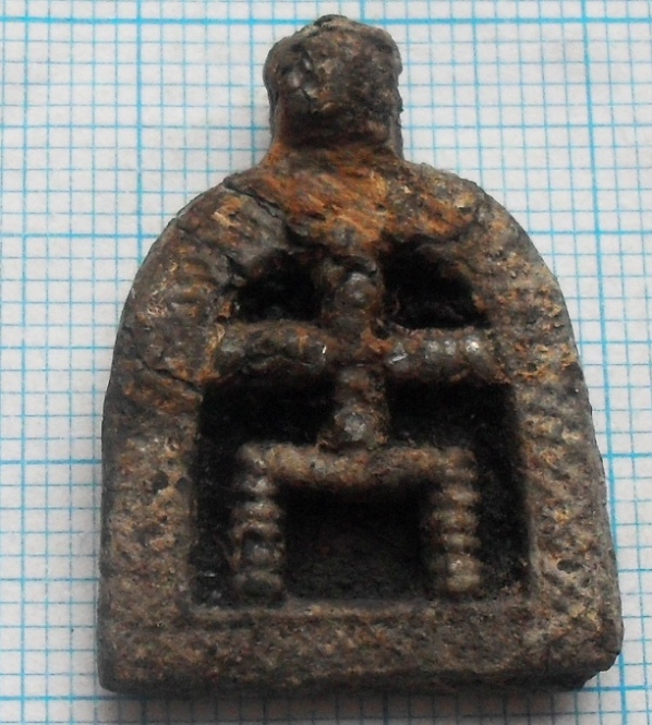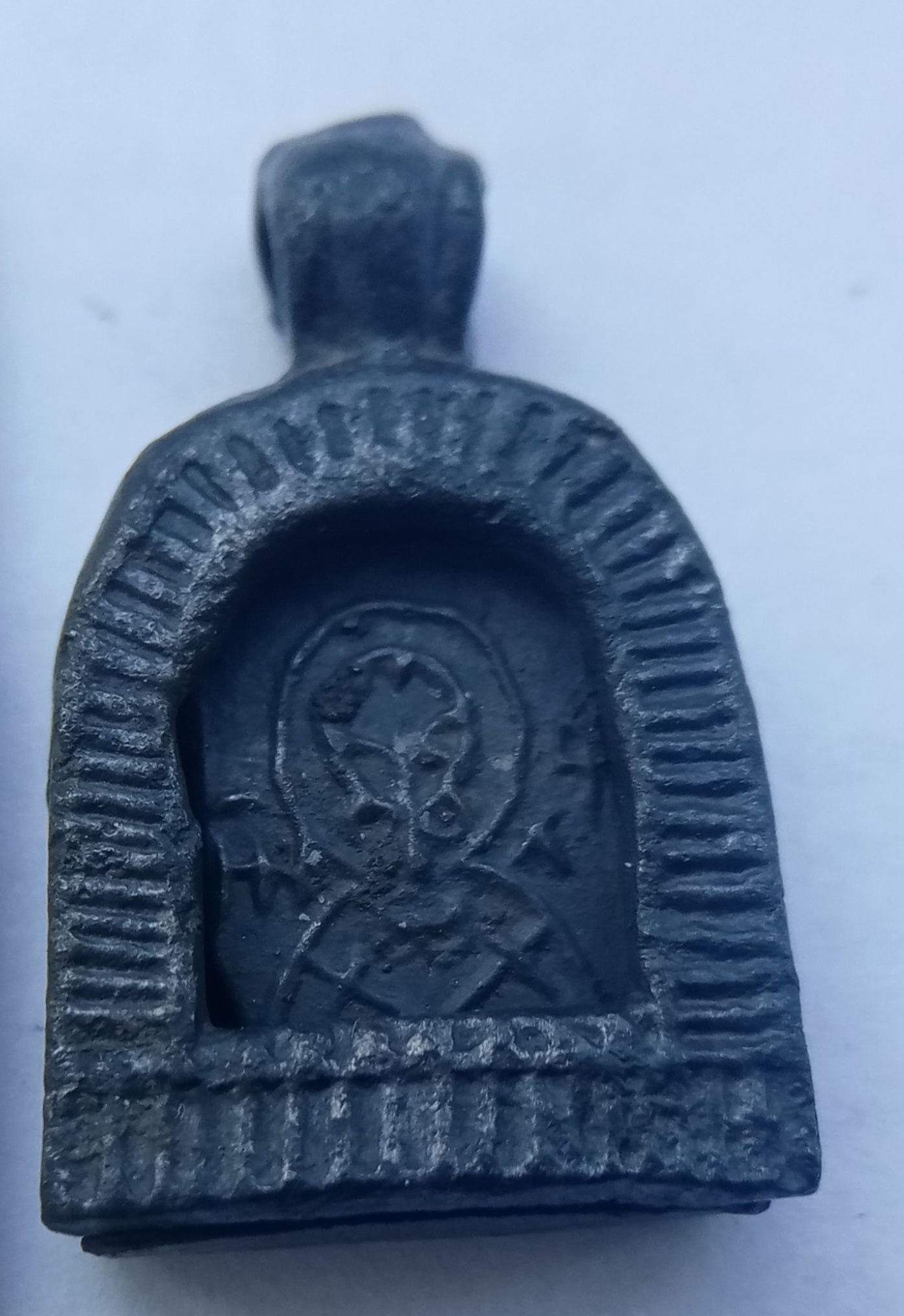 Такие иконки известны, оловянисто-свинцовый сплав и слюдяная вставка внутри, тут вставка из металла, похоже. 14 век.