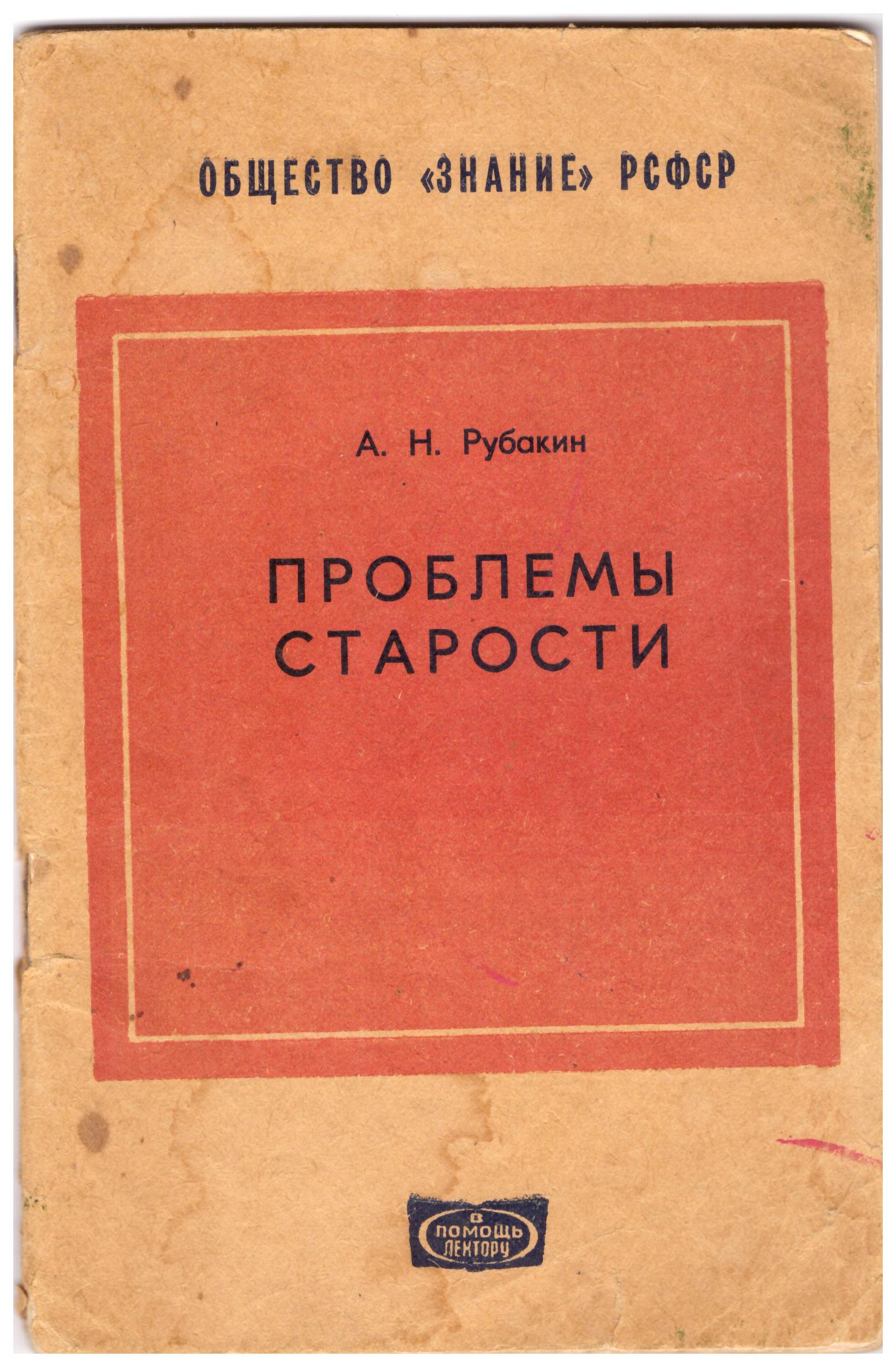 Проблемы старости. / А. Н. Рубакин, д-р мед. наук проф. - Москва : [б. и.], 1969. - 49 с.; (В помощь лектору/ О-во "Знание" РСФСР. Науч.-метод. совет по пропаганде биол. и мед. знаний). Обложка. Обычный формат. Пометки на обложке и в тексте. Замятия страниц. Стоимость 100 руб. Вложенные эскизы изображений |
