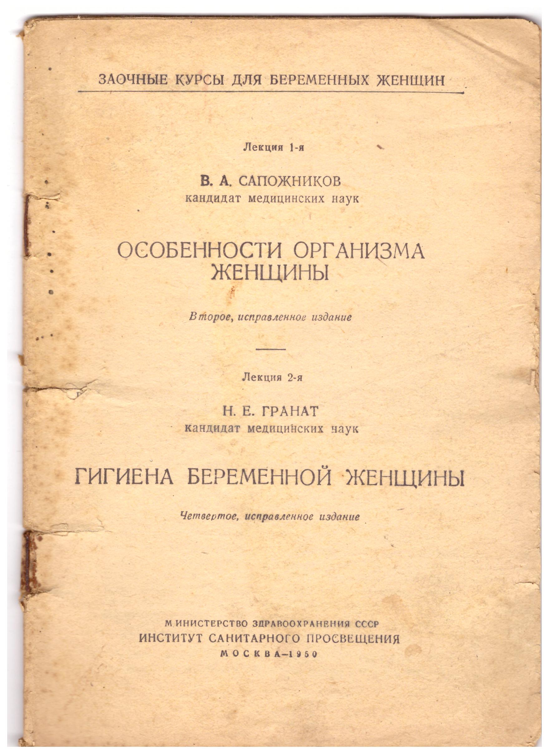 Сапожников, Владимир Иванович. Особенности организма женщины [Текст] / В. А. [!] Сапожников, канд. мед. наук. Гигиена беременной женщины / Н. Е. Гранат, канд. мед. наук. - 4-е изд., испр. - Москва : Ин-т санитарного просвещения, 1950 (тип. изд-ва "Моск. правда"). - 32 с. : ил.; (Заочные курсы для беременных женщин; Лекция 1-2. Обычный формат. Без обложки. Повреждения. Временные пятна. Стоимость 450 руб. Вложенные эскизы изображений |