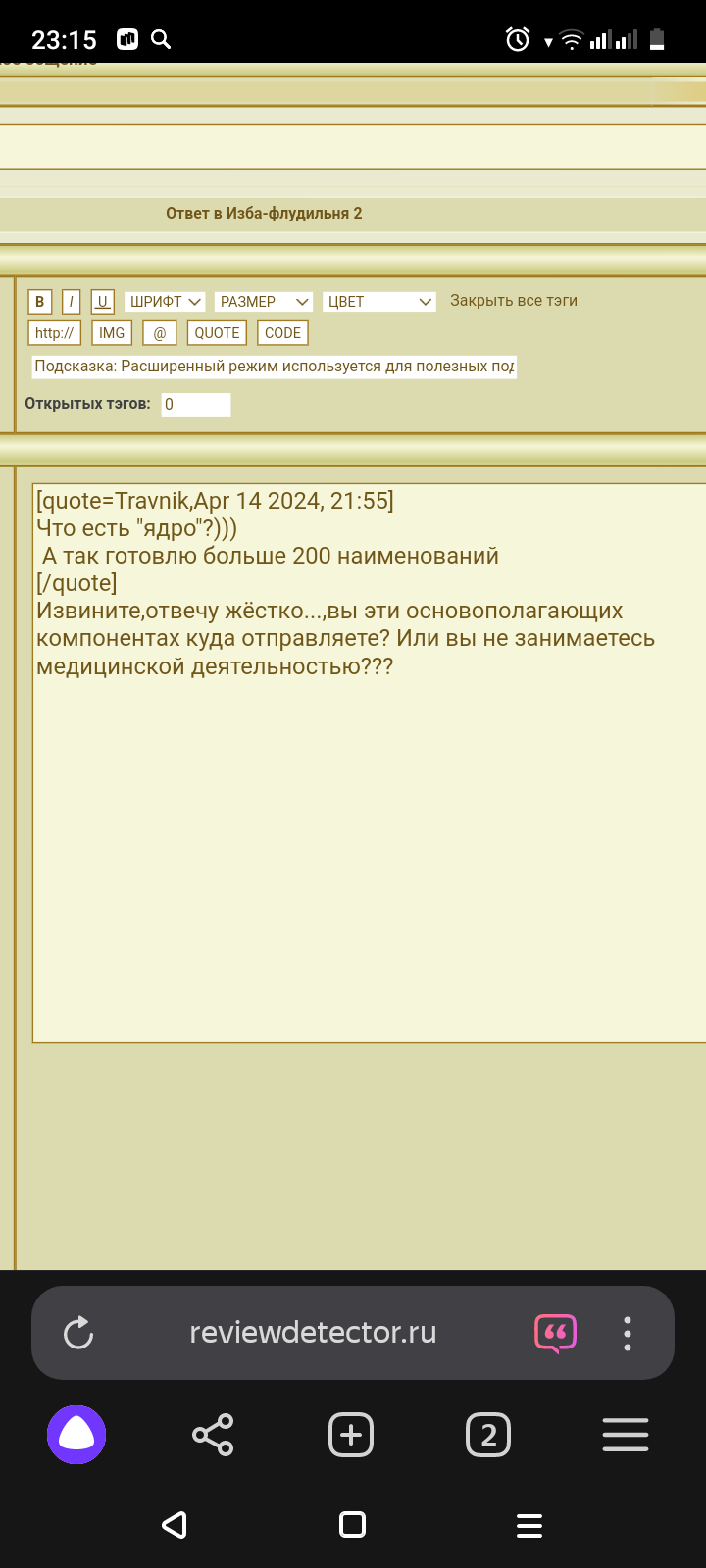 QUOTE(Порш @ Apr 14 2024, 22:17) в чем жёсткость?))) Я заготавливаю и продаю травы, всем, кто покупает. Фито- и фармкомпаниям,, интернет-магазинам, рыночникам, "лекарям", частным лицам.. При этом гарантируя что клиент получит именно то, что ему нужно и отвечаю за качество -------------------- Ad majorem Dei gloriam /К вящей славе Ревьюдетектор/