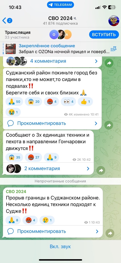 QUOTE(Prorab @ Aug 6 2024, 10:59) Официально: «Сегодня из Суджанского и Кореневского районов поступает информация о попытках прорыва ВСУ на территорию Курской области. Бойцы Пограничной службы ФСБ России и Вооруженных Сил РФ не допустили прорыва границы», – врио губернатора Алексей Смирнов. хорошо если так, а не наоборот, про таволжанку и казинку (грайворон. район) также говорили... в любом случае по Судже ночью поприлетало Сообщение отредактировано takt: Aug 6 2024, 11:51 |
