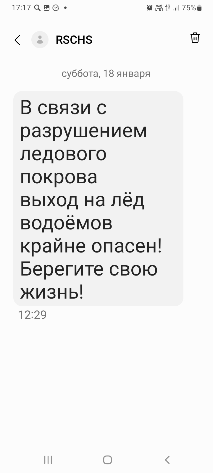 Короче обломище с купанием. МЧС вот такуое сообщения прислал, а так как до проруби метров 50- 70 идти по льду озера то решил я до церкви съездить да битон воды освятить. На даче окатил себя святой водой из ведра да чайка попил с малиновыми веточками.Ляпота ляпотовая однако.