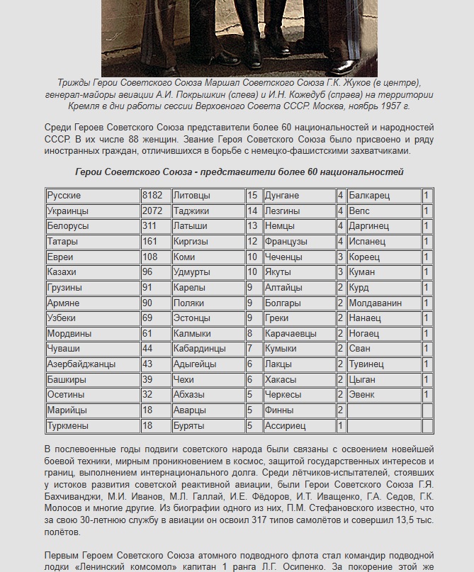QUOTE(GoWest @ Apr 20 2025, 19:28) Сначала не поверил своим глазам, думал панорама, а оказалось не панорама. Может кто объяснит в чём тут фишка? Или только осетины круто воевали в ВОВ? И что вообще происходит? Путин выделил каждому селу и каждой школе миллион рублей в Южной Осетии. «Впереди не менее светлый, важный праздник — 80-летие Великой Победы, поэтому президент России принял еще одно важное решение. Он из своего резервного фонда выделил по миллиону рублей каждому селу в Южной Осетии и каждой школе республики», — заявил журналистам Кириенко. Он отметил участие народа региона в Великой Отечественной войне и специальной военной операции, подчеркнув, что героями из Южной Осетии гордятся по всей стране."© https://news.mail.ru/society/65799980/ Ну может и для Рязани и Киева осталось? ...... С сайта минобороны, количество Героев Советского Союза по национальности. Если пересчитать по количеству военнослужащих к проценту награжденных, , возможно маленькая Украина будет на 1 месте! https://encyclopedia.mil.ru/encyclopedia/hi...75%40cmsArticle Всех провокаторов, пытающихся стравить Братские Народы , на фонарный столб!!! Сообщение отредактировано Валидатор: Apr 20 2025, 20:18 -------------------- Всем добра!