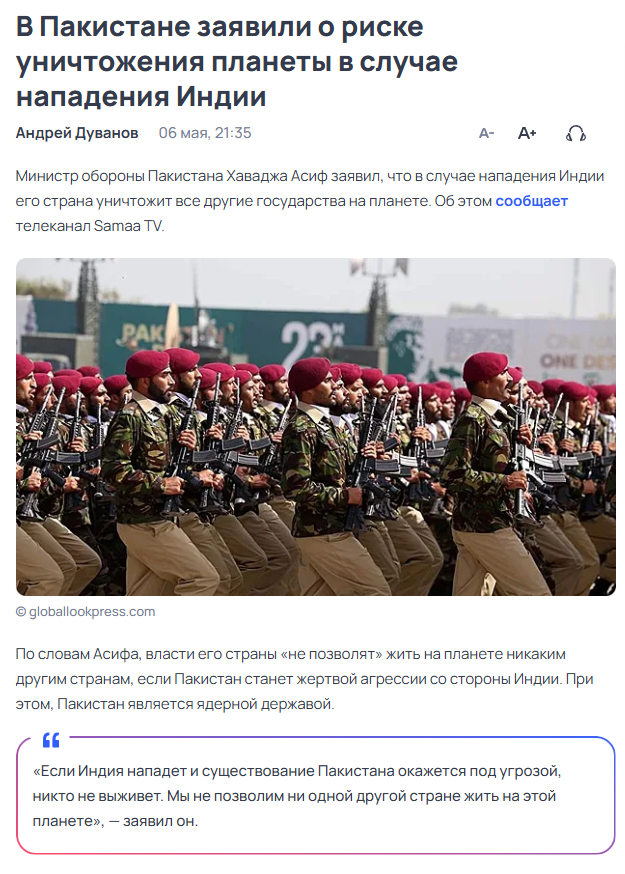 QUOTE(Арчеда+ @ May 7 2025, 20:10) Краем глаза увидал, что индусы с пакистанцами замес начали. А ведь у этих цыган и ядерка у обоих есть... Замес начал тот же «товарищ», что и начал замес Украина/Россия. Всё как обычно. Это была одна страна, один народ, а теперь разъединённый англо-саксой. Пакистан – это та же "Украина", отделённая от Индии в 1947 году. |