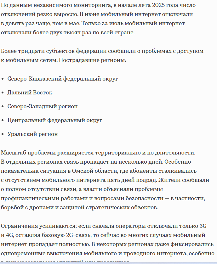 QUOTE(Савостаснова @ Aug 13 2025, 14:23) запчасти нужны , что-то всегда ломается вот что писали в 22 году .....Какое-то время, полгода-год, они, наверное, продержатся. Но потом, если не возобновятся поставки в Россию телеком-оборудования, начнется деградация сетевой инфраструктуры. Последствия предсказать несложно: это ухудшение качества связи и падение скорости мобильного интернета.... Это больше про аварии. А здесь планомерные отключения. -------------------- Мой прежний ник— монархист