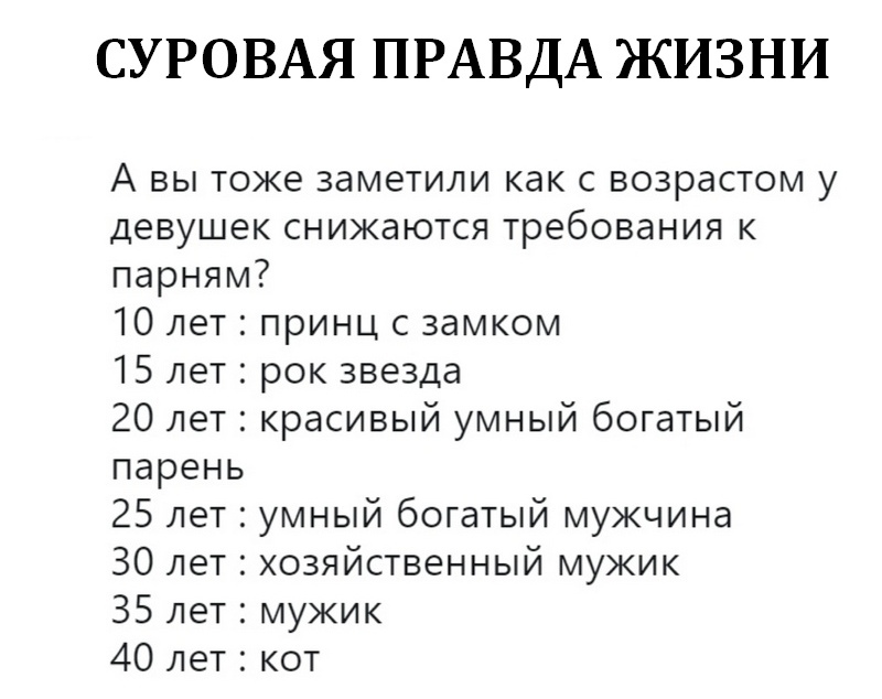 QUOTE(Albrext Durrer @ Nov 3 2025, 14:47) Счастливый и везучий малый. Далее, просто менялись бы условия так же и поднималось бы планка цены(ультиматумы), а в итоге- тоже был бы послан туда же. Вашей дочери, мужчина пока не нужен вообще(для построения отношений), это скорее всего проявление "бабьей дури": у подружек уже есть и мне надо. Им по молодости, надо успеть "ухватить"...чтоб не хуже других) Для отношений, надо "созреть". Это дело серьёзней "карьер". Деньгами, успехом, рано или поздно можно насытиться. А вот женщине, не "половить бабочек в животе", это ни дня, не почувствовать себя женщиной во всей своей жизни. Копаете глубоко, но выводы у вас зачастую противоположные от реальных. -------------------- То, что нас не убивает - делает нас сильнее.