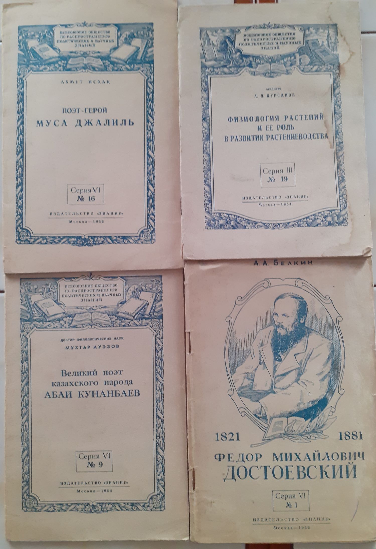 А. Исхан. Поэт-герой Муса Джалиль. 1956 г. 24 с. Обложка. Штамп. М. Ауэров. Великий поэт казахского народа Абай Кунакбаев. 1954 г. 24 с. Обложка. Штамп. А.Л. Курсанов. Физиология растений и ее роль в развитии растениеводства. 1954 г. 32 с. Обложка. Штамп. А.А. Белкин. Ф.М. Достоевский. 1956 г. 40 с. Обложка. Штамп. Стоимость любой 100 руб. Вложенные эскизы изображений |